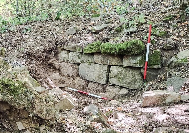 Più interessante la cinta muraria che è stata svelata per un breve tratto dalla caduta di un albero proprio sul ciglio che delimita il pianoro sommitale! (vedi figura 2)