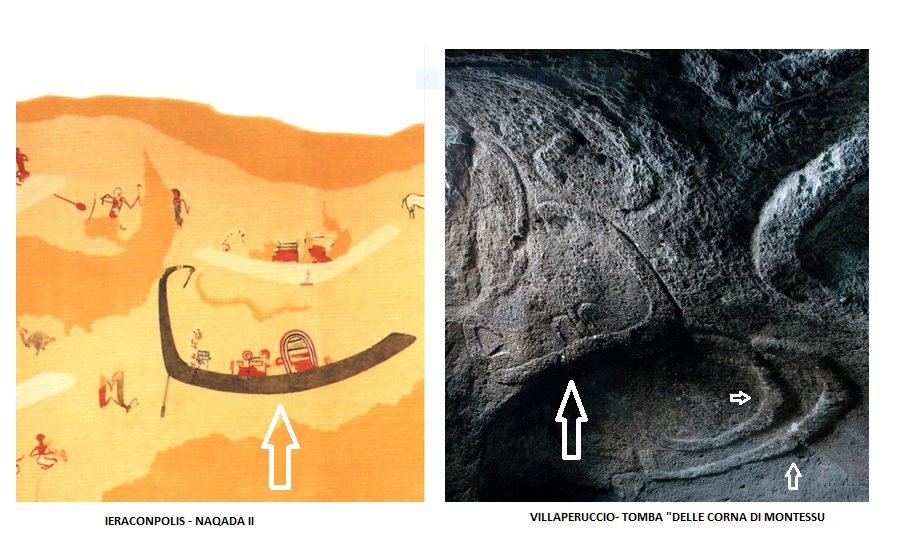 Nella così detta “domu delle corna” a Montessu, sono incisi alcuni petroglifi che in realtà non hanno nulla a che vedere con delle protomi taurine, ma sembrano invece raffigurare le barche solari che compaiono in una pittura parietale e in alcuni vasi della cultura egizia di Naqada II, che si svolse tra il 3500 e il 3200 a.C. (l’argomento è stato succintamente trattato nel post che segue):
