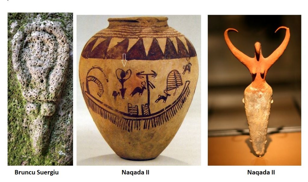 Ma per tornare a Bruncu Suergiu e all’”elemento decorativo” di natura femminile, sorprende non poco la somiglianza con la figura riportata su di un vaso risalente a Naqada II ma anche con una statuetta in terracotta, sempre risalente alla stessa cultura ed esposta al Brooklyn Museum di New York.