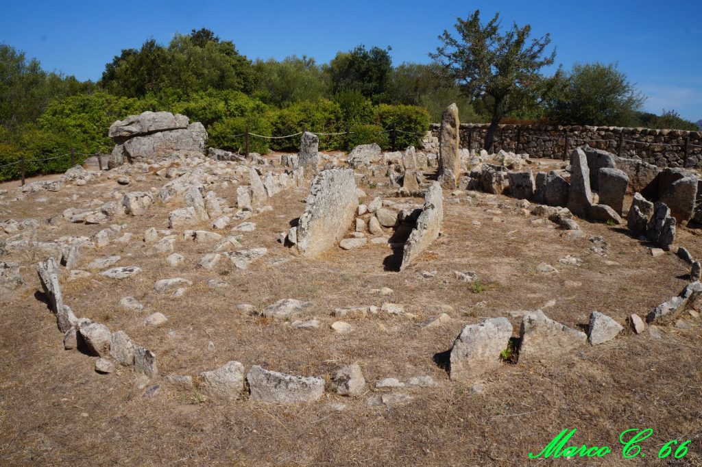 “La necropoli neolitica di Li Muri rappresenta sicuramente il sito archeologico più conosciuto della vasta area di Arzachena per la singolarità dei sepolcri che la compongono. Scoperta nel 1939, è composta da una serie di cisti dolmeniche, ossia di piccole celle per la sepoltura costituite da lastre infisse a coltello, in origine dotate di una lastra di copertura, contornate da lastrine disposte a cerchi concentrici. Queste ultime avevano la funzione di contenere un tumulo di terra e pietrisco che doveva ricoprire il sepolcro, evitandone per quanto possibile il dilavamento dovuto alla pioggia. La necropoli nella sua completezza doveva perciò apparire come un insieme di collinette circolari, tangenti fra di loro, di diametro variabile da 5,30 a 8,50 metri. Nel circolo che delimitava ogni sepolcro sono presenti i resti di un menhir, cippo di pietra infisso nel terreno a cui si attribuiva un valore sacrale. In prossimità dei punti di tangenza dei circoli funerari sono state rinvenute tre cassette di pietra, dalle dimensioni di circa cm. 50X50, destinate probabilmente ad accogliere periodiche offerte alimentari per i defunti. Alcuni oggetti componenti i corredi funerari di questa necropoli, tra i quali coppette in steatite, lame di selce e piccole accette triangolari in pietra dura levigata, grani di collana a forma di piccole olive, presentano una lavorazione particolarmente raffinata. La tipologia dei sepolcri della necropoli di Li Muri ha dato il nome ad una cultura ascrivibile all’età Neolitica (IV millennio a.C.): quella dei “circoli megalitici”, detta anche Cultura di Arzachena o Cultura Gallurese, per la particolare concentrazione appunto in questo territorio di circoli tombali con cista litica”. (Mibact)