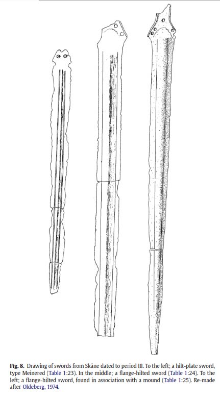- T 16, Periodo II–III, Flanged-hilted sword (“Das Schwert mit ausgebauchter Zunge”), datata tra il 1500 e il 1300 a.C., Skåne.
