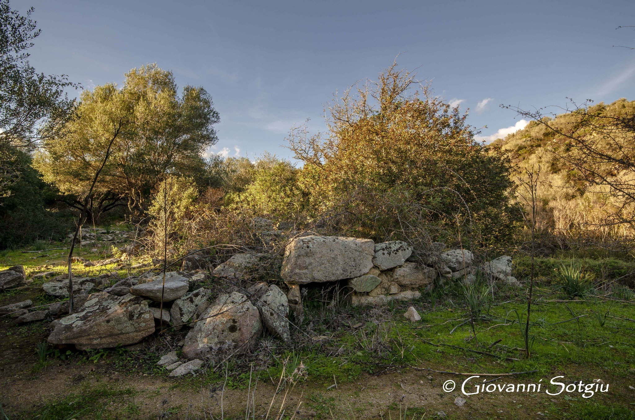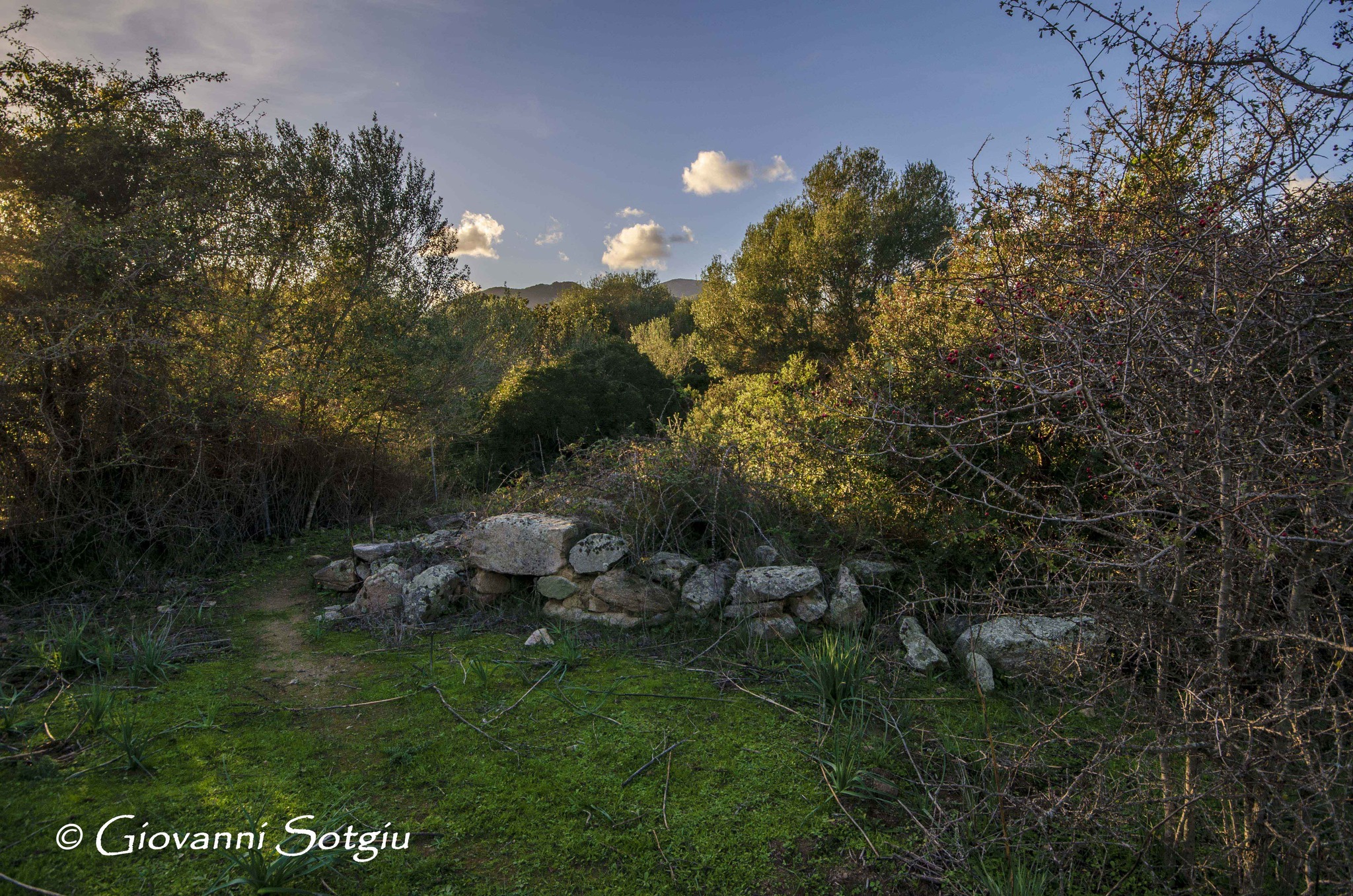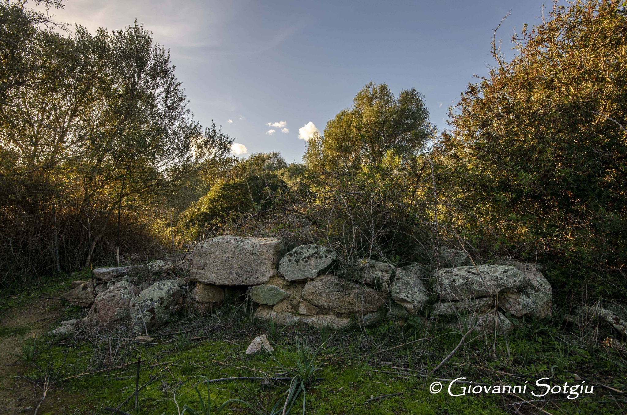Nuraghe costruito con conci di calcare bianco sopra un ammasso roccioso emergente dal fitto bosco. Le murature si conservano ad altezza d’uomo.