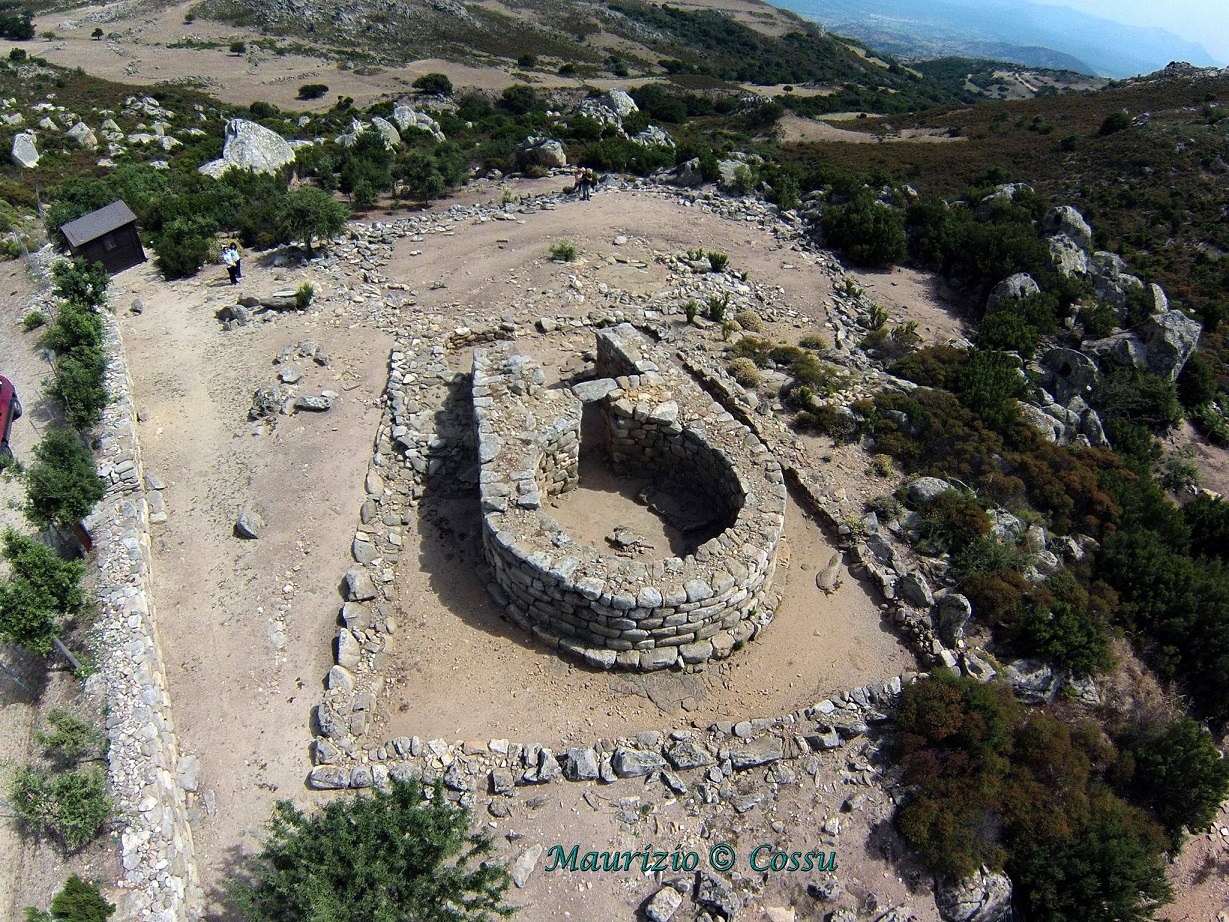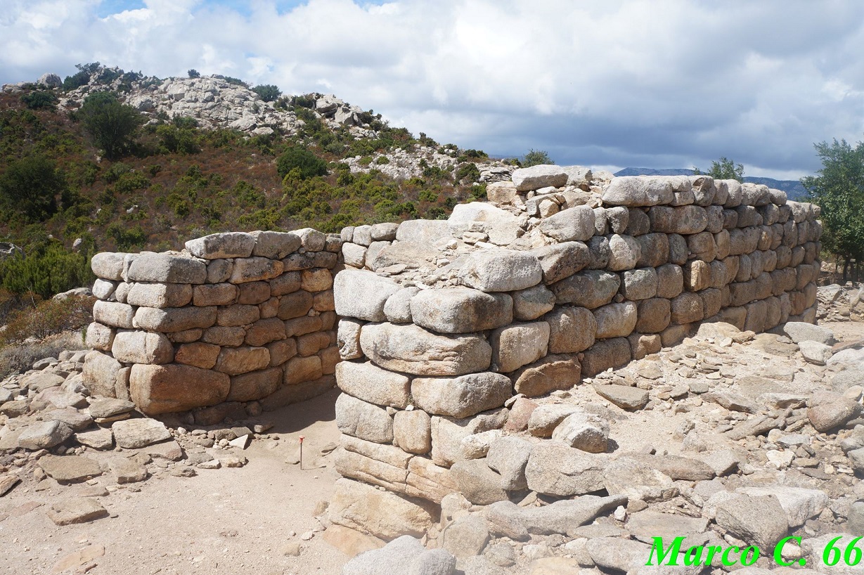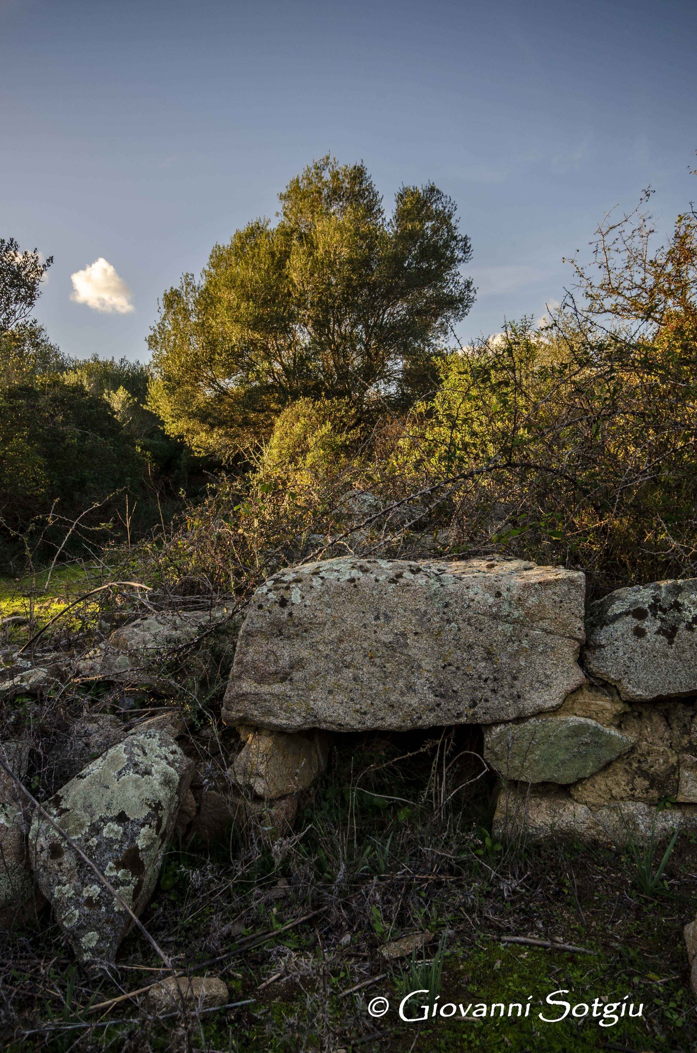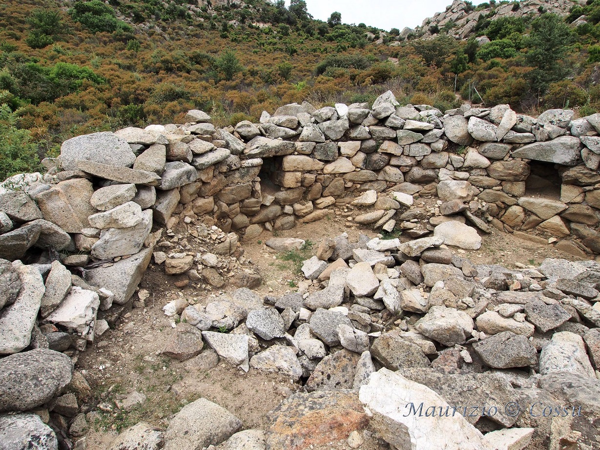 Nuraghe costruito con conci di calcare bianco sopra un ammasso roccioso emergente dal fitto bosco. Le murature si conservano ad altezza d’uomo.