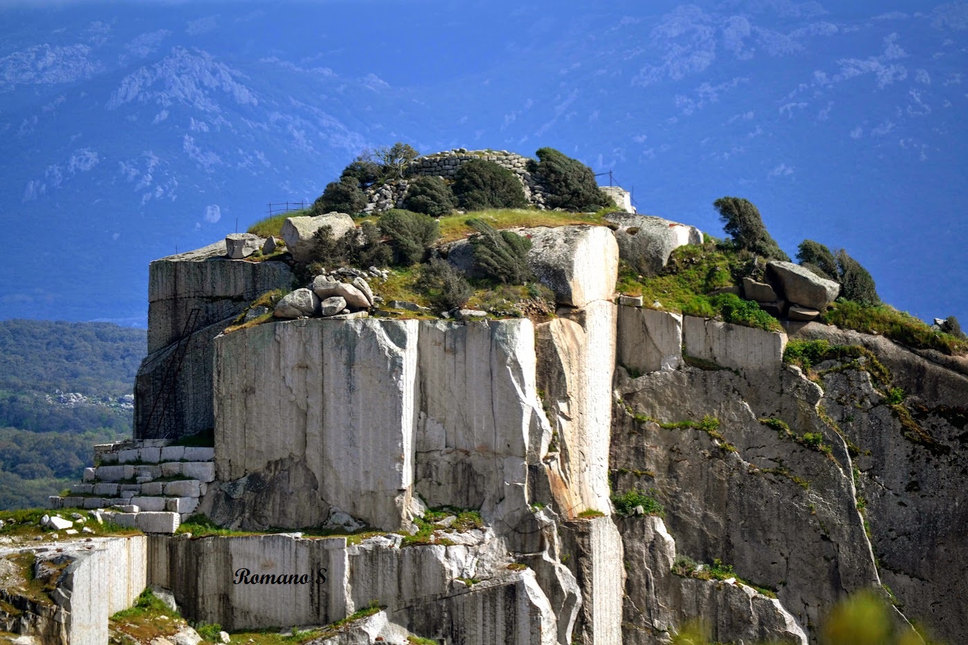 Il nuraghe è rimasto isolato in cima a un ammasso roccioso interno a una vasta cava.