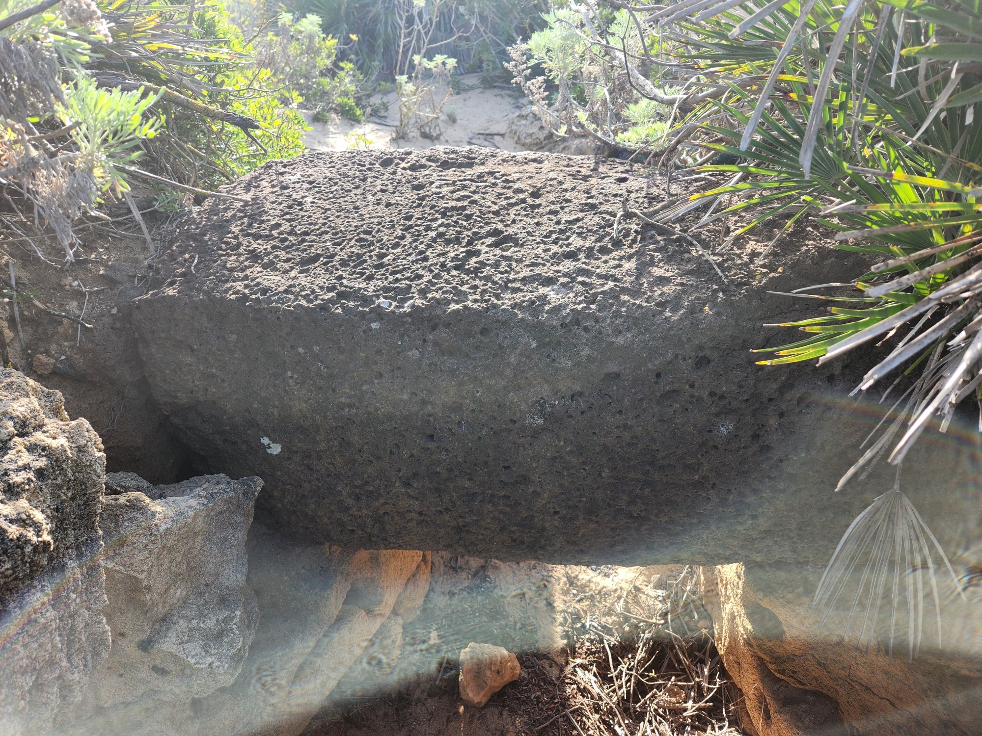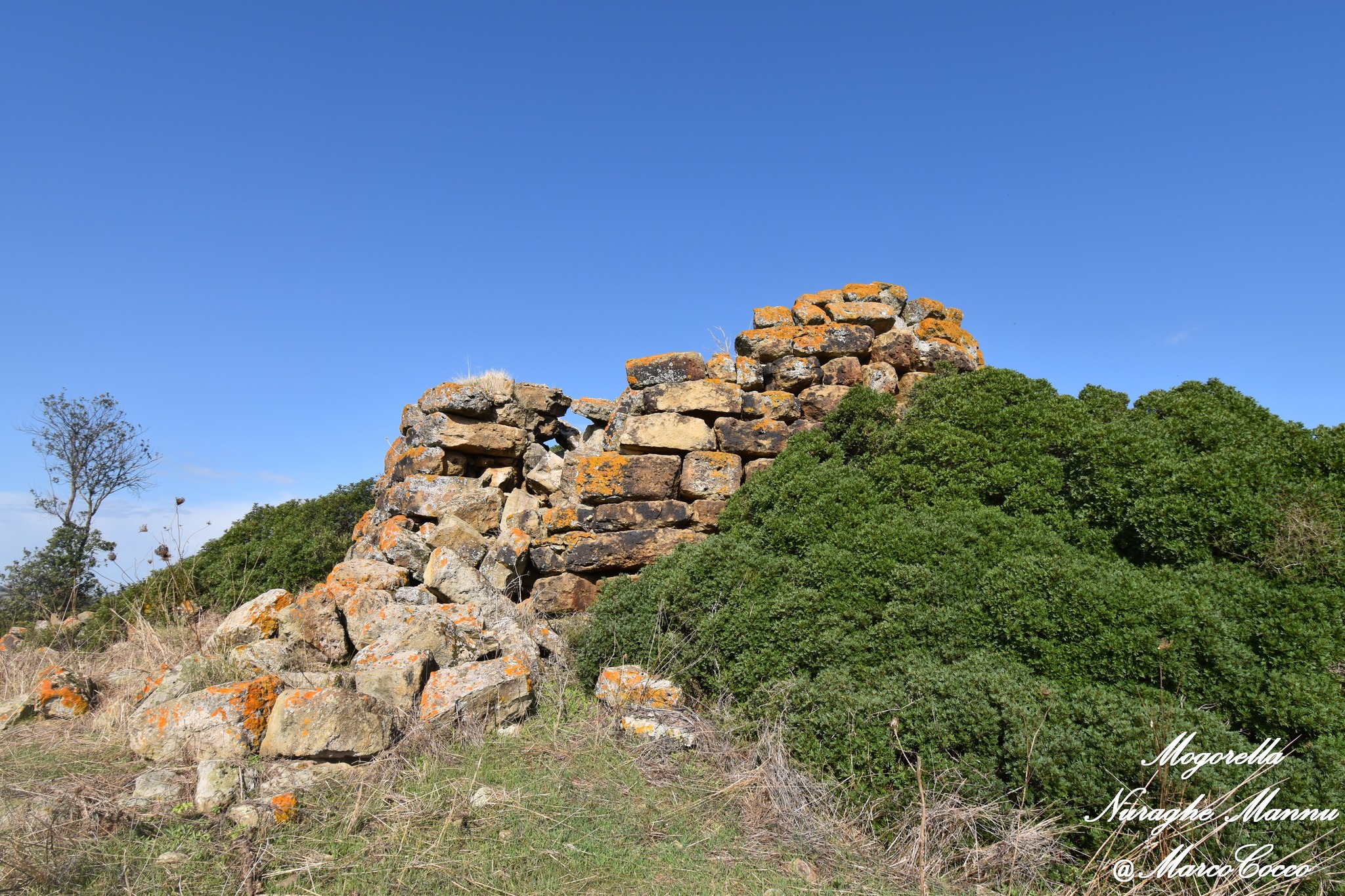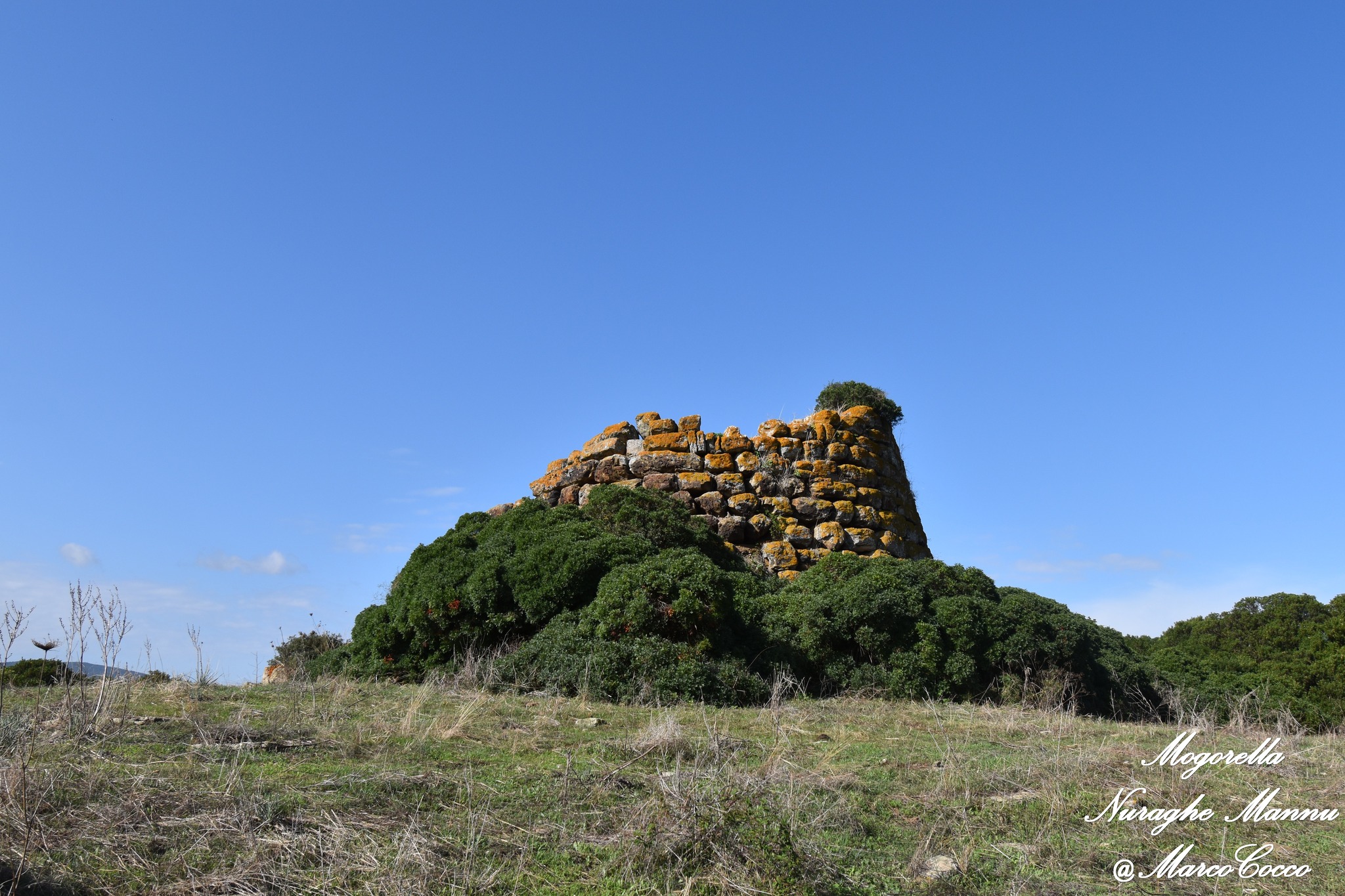 Nuraghe a torre coperto dalla sabbia. Nel suo intorno sono evidenti tracce di insediamento e un pozzo scavato nella roccia.