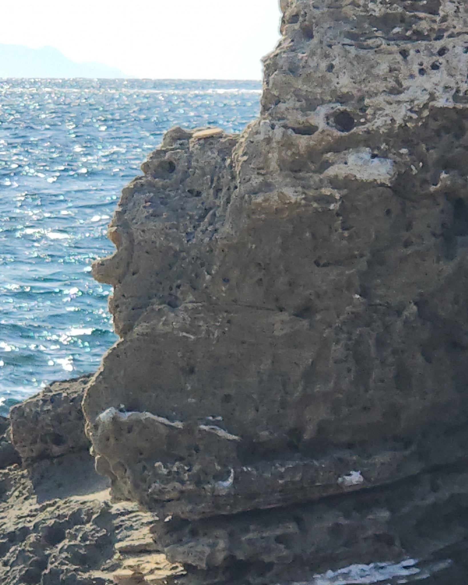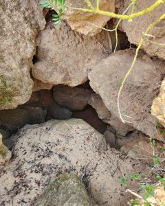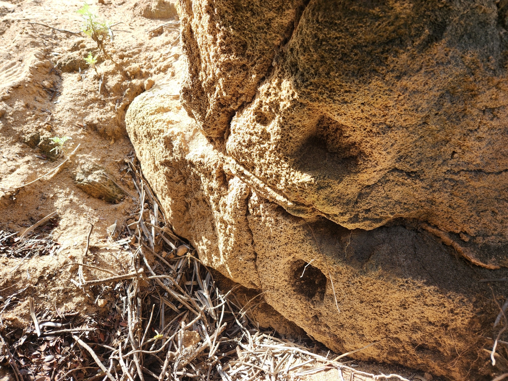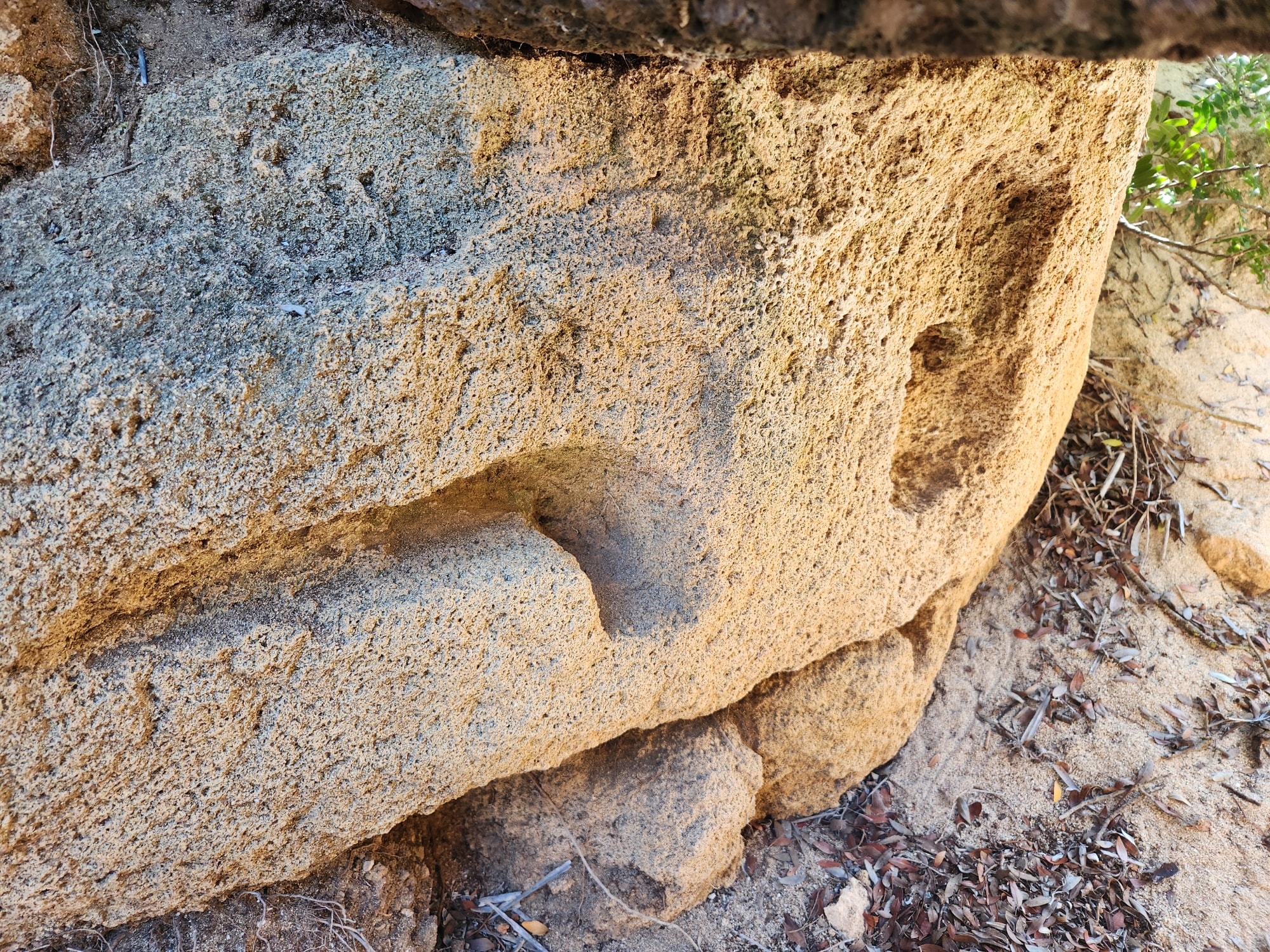Nuraghe a torre coperto dalla sabbia. Nel suo intorno sono evidenti tracce di insediamento e un pozzo scavato nella roccia.