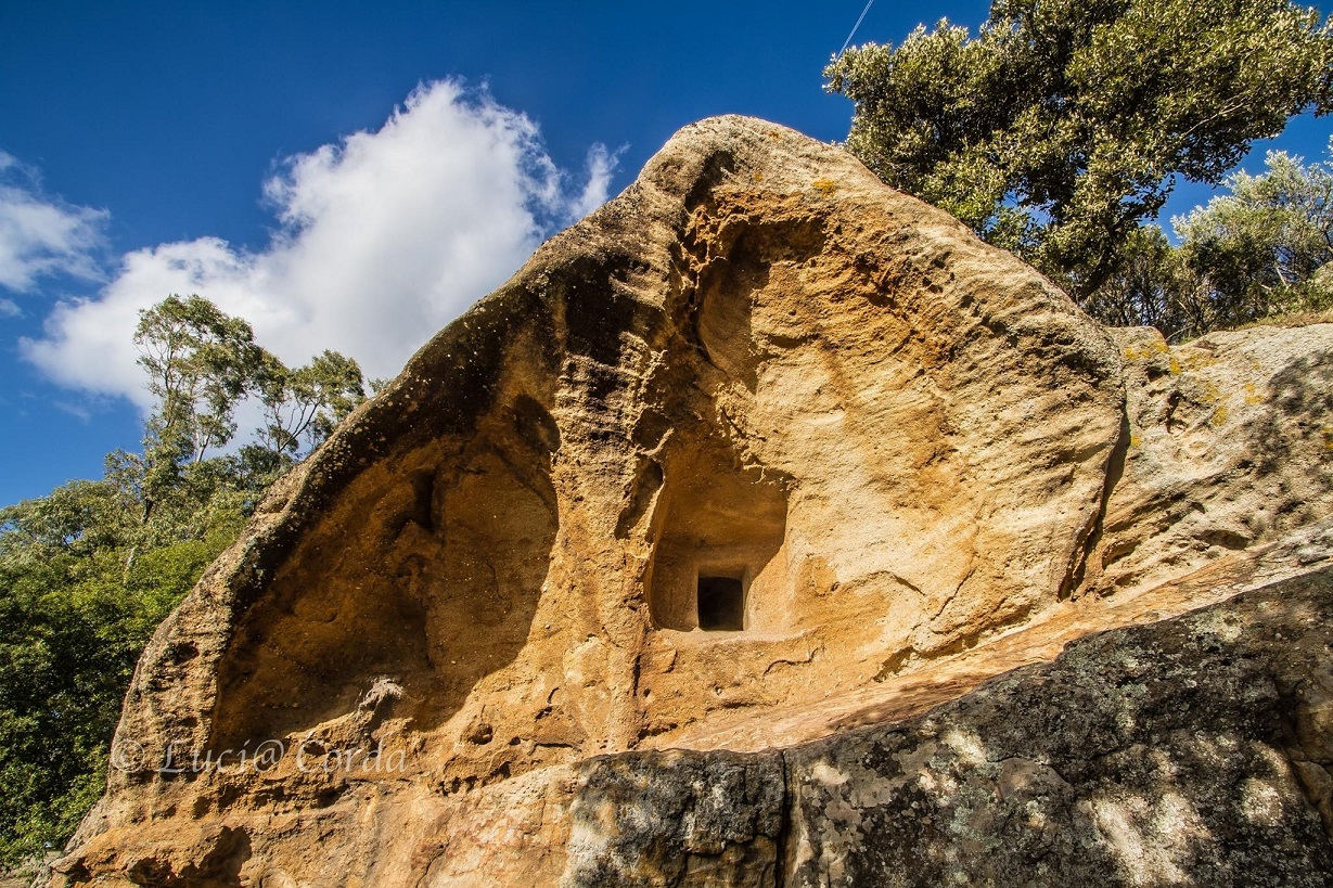 Ipogei il cui nome pare significare “case di fate o streghe”, anche se tale denominazione è oggetto di altre interpretazioni. Sono dette anche di forru o furreddos (forno, fornelli), o di conca o conchedda o percia (precca) per la figura cava del loro interno. Sono grotticelle artificiali scavate sotto terra o nella roccia tenera, che presentano tre tipi di ingresso: a corridoio, il terreno scende gradualmente verso i piani del sottosuolo dove è scavata la tomba; a pozzetto, con ingresso dall’alto e piccolo vestibolo che dà accesso alla tomba vera e propria; a portello, scavata a balza rocciosa, con ingresso praticamente orizzontale. Si possono presentare isolate, in piccoli gruppi o in vaste necropoli. Ve ne sono sia di tipo semplice, monocellulare, a pianta rotonda o quadrata, sia di tipi più complessi con diversi ambienti collegati da corridoi che si sviluppano in piano dietro l’apertura di finestrelle rettangolari su balze rocciose verticali. Gli ambienti sono disposti intorno ad una camera centrale; i tetti tendono generalmente a riprodurre quelli di capanne e case; le pareti sono spesso dipinte (di rosso o color ocra), scolpite o decorate con false porte, pilastri, protomi taurine, spirali, colonne e nicchie. La realizzazione delle prime domus de janas – se ne contano più di 3500-, risale presumibilmente alla prima metà del neolitico (circa 5800/5700 anni fa).