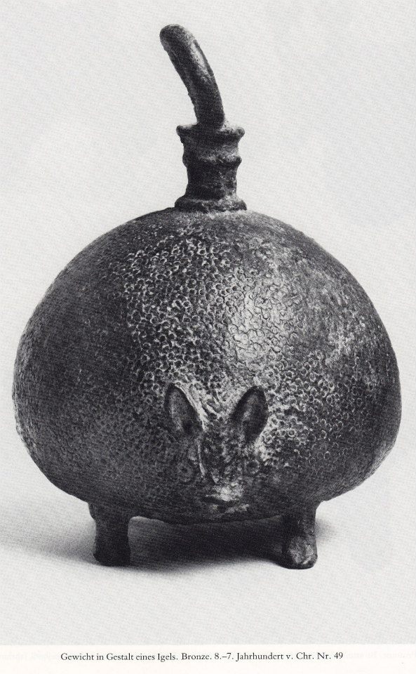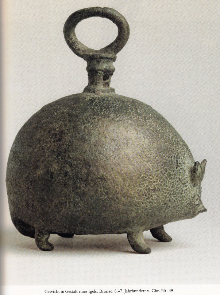 L’introduzione e la normativa delle misure e dei pesi è stato di grandissima importanza per le prime culture dell’Asia minore poiché stavano alla base di una amministrazione funzionante per i tributi e per i beni di scambio. Molto presto sono stati creati pesi con forme simboliche, per esempio di animali. Per il nostro esemplare venne scelto il riccio, che nell’antichità era garanzia di affidabilità, vigilanza e costanza, qualità queste di basilare importanza per l’uso di un peso .