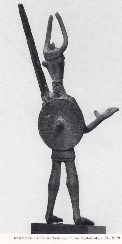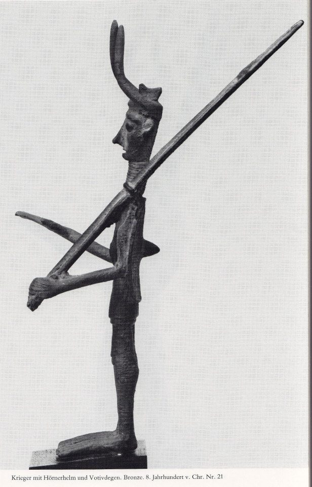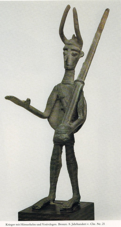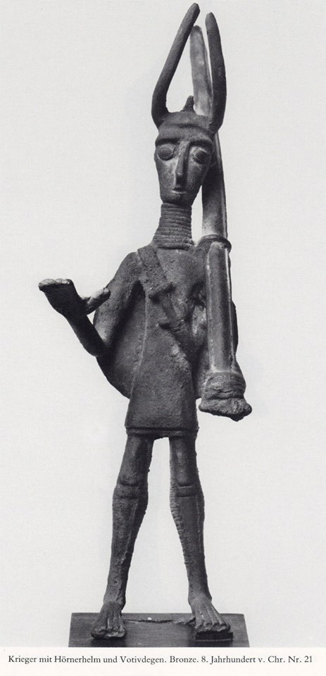 Guerriero con elmo ornato di corna e spada votiva