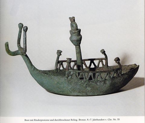La forte, forse un poco grossolana semplificazione della protome sembra indicare una già avanzata età arcaica dell’arte sarda del bronzo. Anche l’albero, che manca nelle più antiche rappresentazioni di navicelle sarde, sembra sostenere questa datazione (vedere catalogo pag. 44).