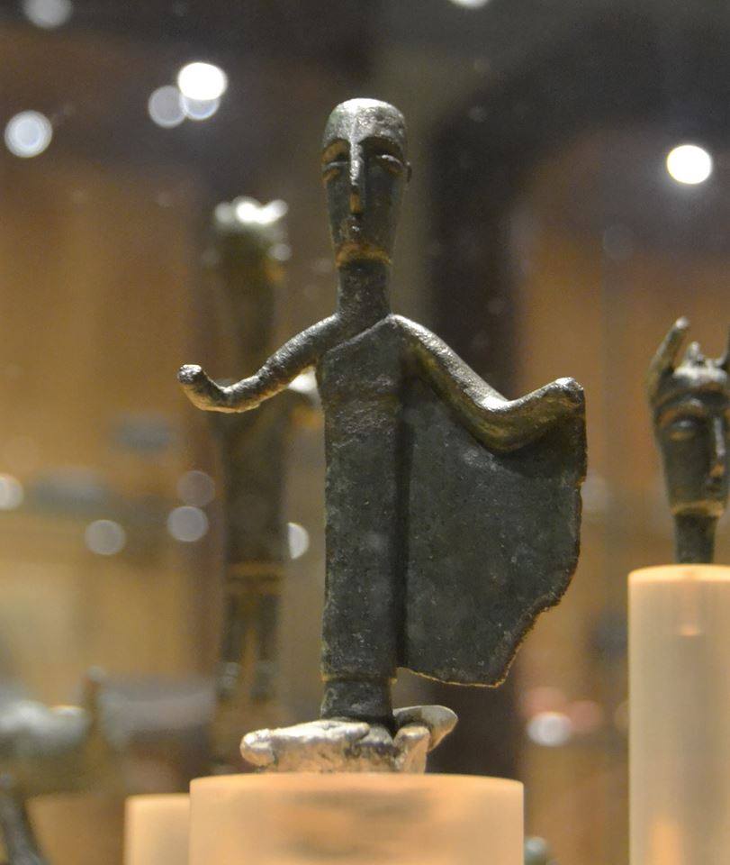 Vestiario e aspetto: copricapo a calottina, capelli di media lunghezza con frangia sulla fronte, lunga tunica che arriva fino ai piedi a mezze maniche, mantello con orlo frangiato sostenuto col braccio destro, piedi scalzi; con una mano forse porgeva un’offerta