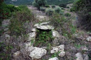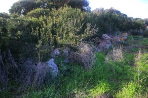 Interessante tomba di giganti a stele centinata bilitica di cui si conserva la parte inferiore con portello. Presente anche l’esedra e la camera funerari
