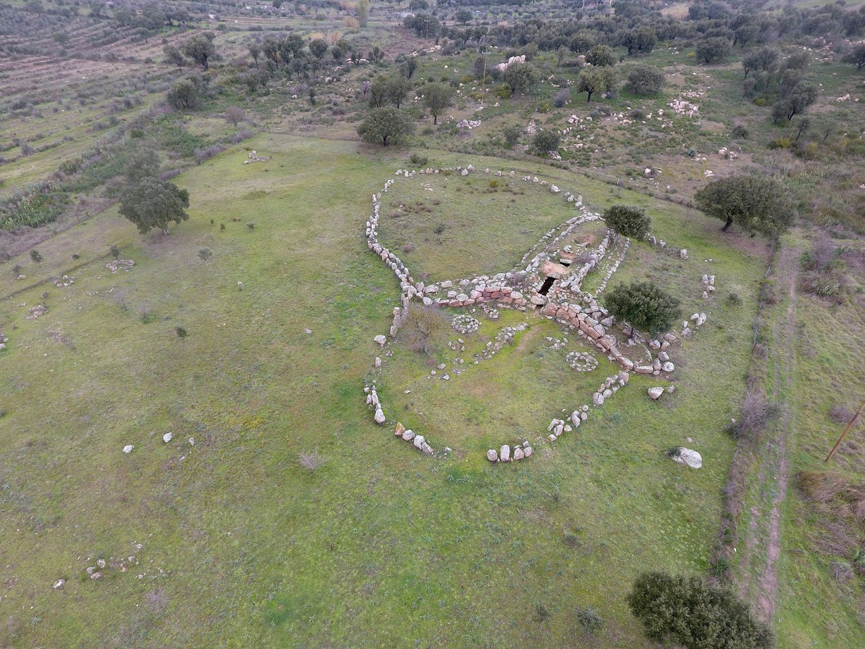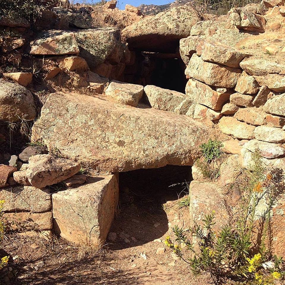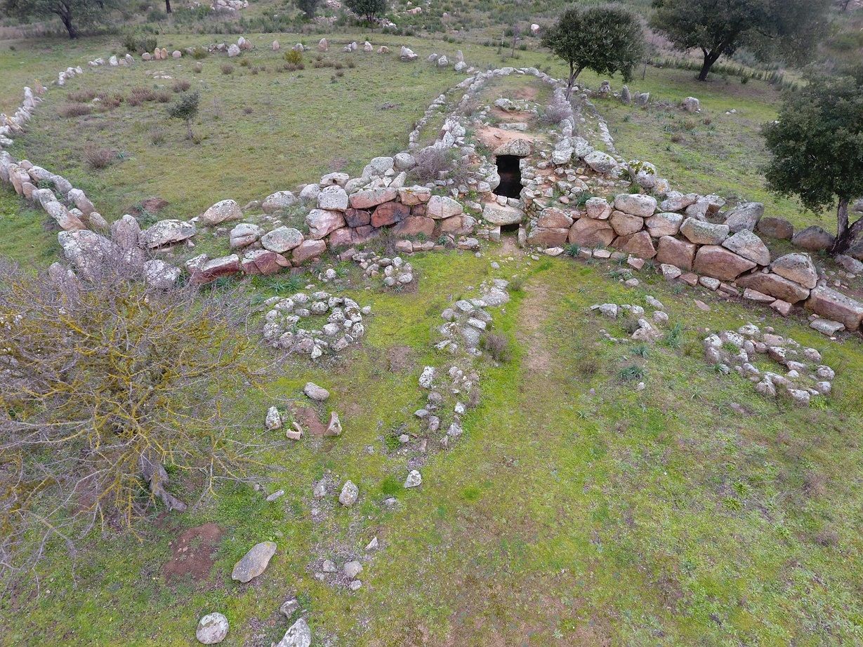 detta anche “Sa Grutta de Santu Giuanni”, presenta il classico schema planimetrico delle tombe di giganti. Il corpo tombale (m 22,10), disposto lungo l”asse NS con ingresso a S, è delimitato all”esterno da file di blocchi di granito di diverse dimensioni. Il prospetto risulta ancora parzialmente interrato e ingombro di pietrame. Le fiancate, l’abside e le ali dell’esedra sono rifasciate da una crepidine formante un basso gradino che, oltre a fornire maggiore staticità all’edificio, impedisce all’acqua piovana di penetrare all’interno della camera. Le ali dell’esedra sono costruite con filari orizzontali di blocchi (corda m 17,7 – esternamente m 24,10 – e freccia m 5,60). L’ingresso è situato al centro dell’esedra. Nell’andito, sull’ingresso, appaiono due portelli separati dal diaframma formato da un architrave in granito inserito sugli stipiti laterali a m 0,45 dal pavimento; la porticina sovrastante, a sezione tronco-ogivale, doveva essere in origine chiusa, a sua volta, da un’architrave di copertura. I due portelli e gli architravi mediano e superiore – di cui si è ipotizzata la presenza – imitano rispettivamente le zone cave e le bande rilevate della stele centinata delle tombe di giganti.