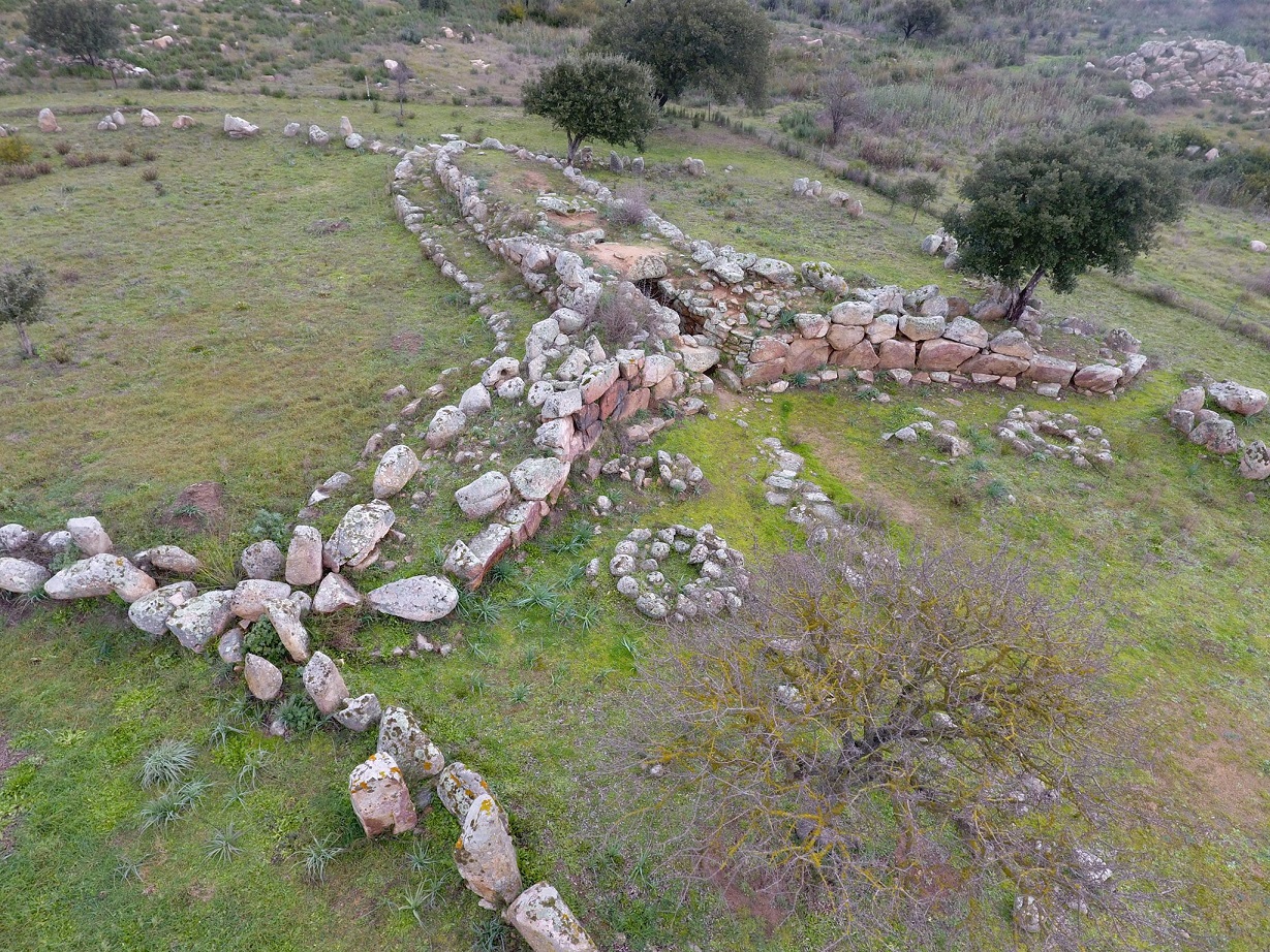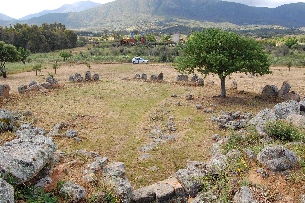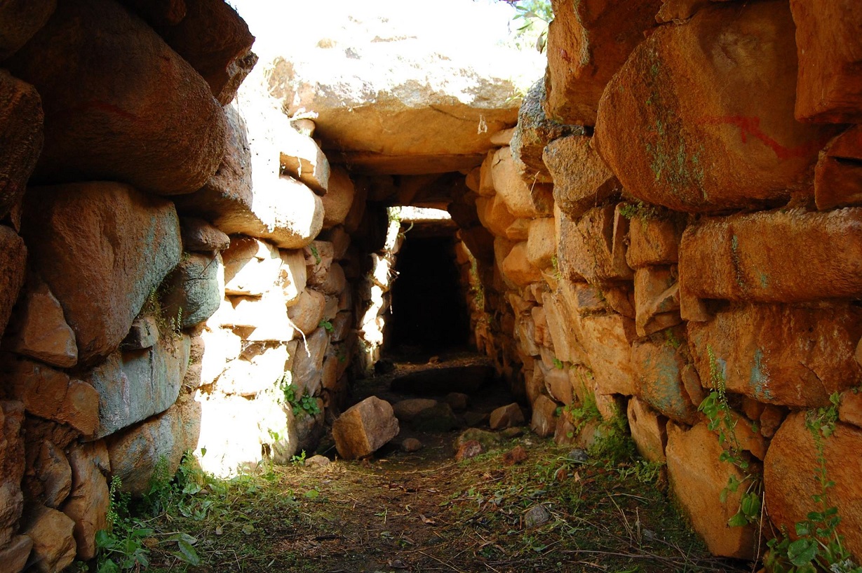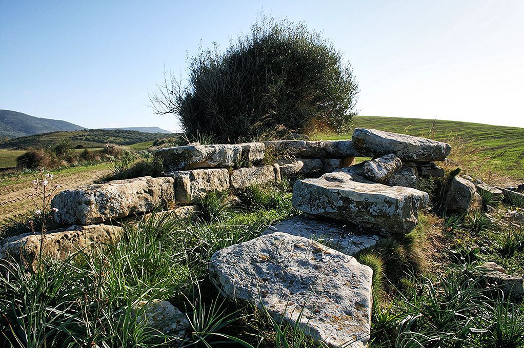 detta anche “Sa Grutta de Santu Giuanni”, presenta il classico schema planimetrico delle tombe di giganti. Il corpo tombale (m 22,10), disposto lungo l”asse NS con ingresso a S, è delimitato all”esterno da file di blocchi di granito di diverse dimensioni. Il prospetto risulta ancora parzialmente interrato e ingombro di pietrame. Le fiancate, l’abside e le ali dell’esedra sono rifasciate da una crepidine formante un basso gradino che, oltre a fornire maggiore staticità all’edificio, impedisce all’acqua piovana di penetrare all’interno della camera. Le ali dell’esedra sono costruite con filari orizzontali di blocchi (corda m 17,7 – esternamente m 24,10 – e freccia m 5,60). L’ingresso è situato al centro dell’esedra. Nell’andito, sull’ingresso, appaiono due portelli separati dal diaframma formato da un architrave in granito inserito sugli stipiti laterali a m 0,45 dal pavimento; la porticina sovrastante, a sezione tronco-ogivale, doveva essere in origine chiusa, a sua volta, da un’architrave di copertura. I due portelli e gli architravi mediano e superiore – di cui si è ipotizzata la presenza – imitano rispettivamente le zone cave e le bande rilevate della stele centinata delle tombe di giganti.