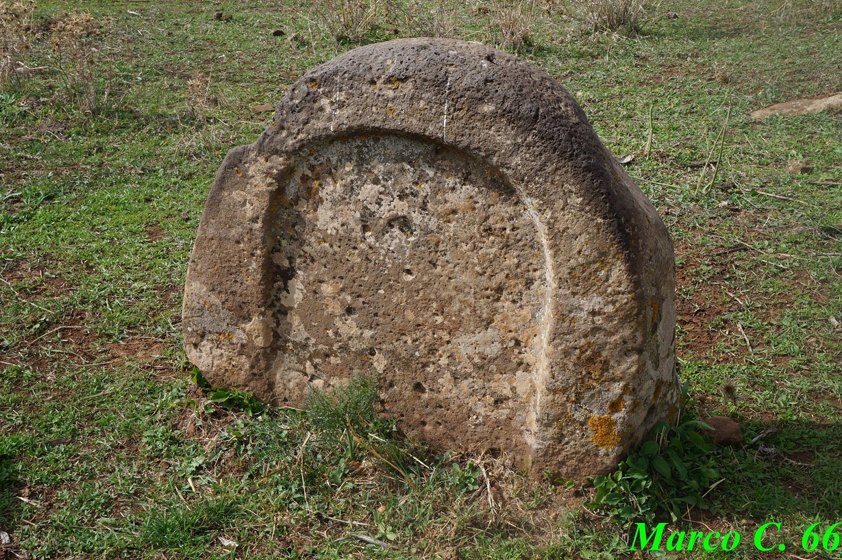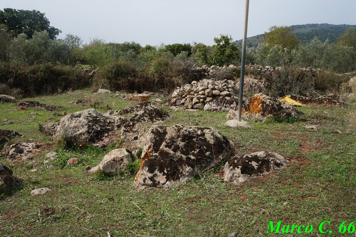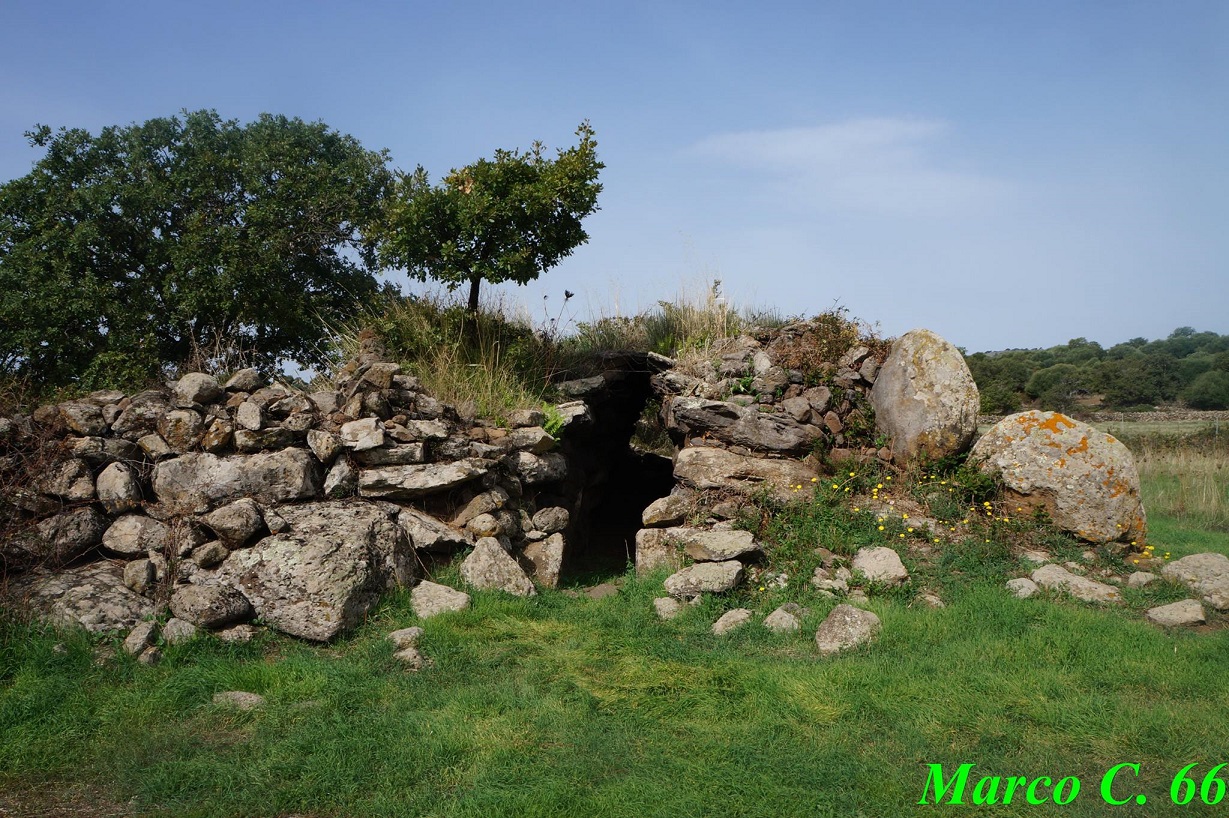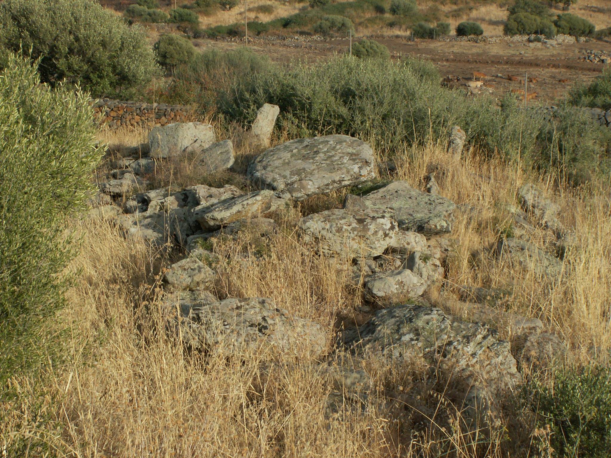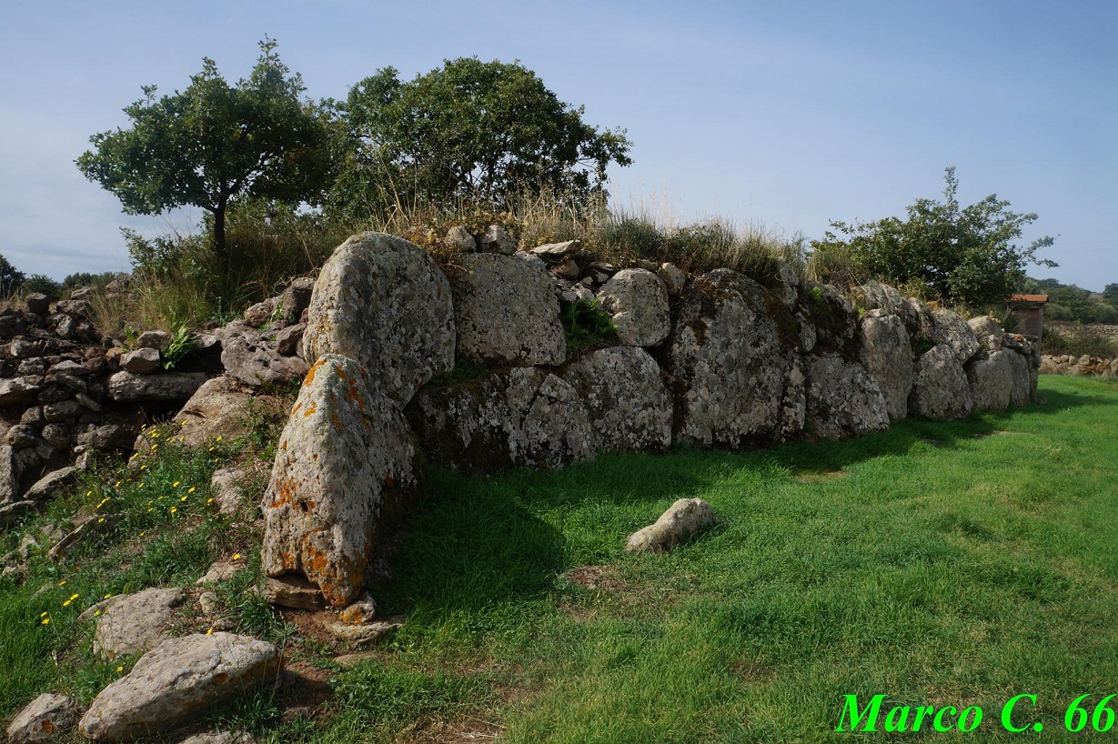 esedra semicircolare orientata a SE, delimitata da grandi lastroni ortostatici; corpo allungato (lun. m.6.15–lar. m.3 all’innesto con l’esedra – e 2 m. nel tratto terminale) con camera funeraria di m.4.43 di lung. e m.0.55 di larg. Al centro dell’esedra è visibile, veramente maestosa, la parte inferiore della stele centinata bilitica (largh.1.10 – spess. 0.22) con portello trapezoidale (largh. 0.24 – alt. 0.20). Un altro frammento centinato della stele si trova rovesciato sulla tomba.