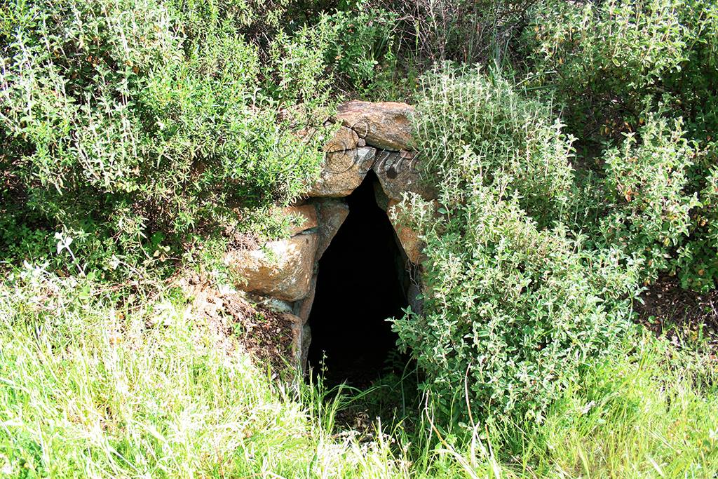 detta anche “Sa Grutta de Santu Giuanni”, presenta il classico schema planimetrico delle tombe di giganti. Il corpo tombale (m 22,10), disposto lungo l”asse NS con ingresso a S, è delimitato all”esterno da file di blocchi di granito di diverse dimensioni. Il prospetto risulta ancora parzialmente interrato e ingombro di pietrame. Le fiancate, l’abside e le ali dell’esedra sono rifasciate da una crepidine formante un basso gradino che, oltre a fornire maggiore staticità all’edificio, impedisce all’acqua piovana di penetrare all’interno della camera. Le ali dell’esedra sono costruite con filari orizzontali di blocchi (corda m 17,7 – esternamente m 24,10 – e freccia m 5,60). L’ingresso è situato al centro dell’esedra. Nell’andito, sull’ingresso, appaiono due portelli separati dal diaframma formato da un architrave in granito inserito sugli stipiti laterali a m 0,45 dal pavimento; la porticina sovrastante, a sezione tronco-ogivale, doveva essere in origine chiusa, a sua volta, da un’architrave di copertura. I due portelli e gli architravi mediano e superiore – di cui si è ipotizzata la presenza – imitano rispettivamente le zone cave e le bande rilevate della stele centinata delle tombe di giganti.