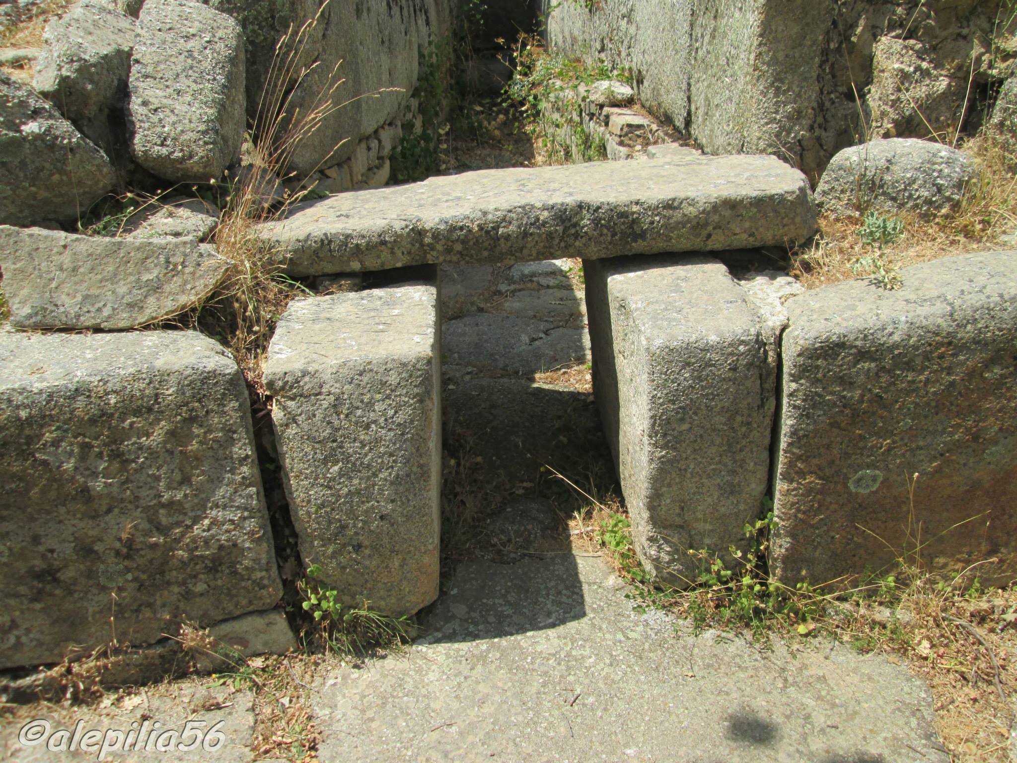 Queste grandi opere sono realizzati in lastre di calcare disposte a filari progressivamente sempre più aggettanti verso l’alto e la copertura era ottenuta mediante una serie di lastre che fungevano da architrave. Da notare la pavimentazione ottenuta con dei grandi massi squadrati con uno spessore di una decina di cm. Abbiamo riportato solo 3 delle 4 tombe presenti sulla collina. Da notare i due massi che presentano dei solchi molto evidenti.