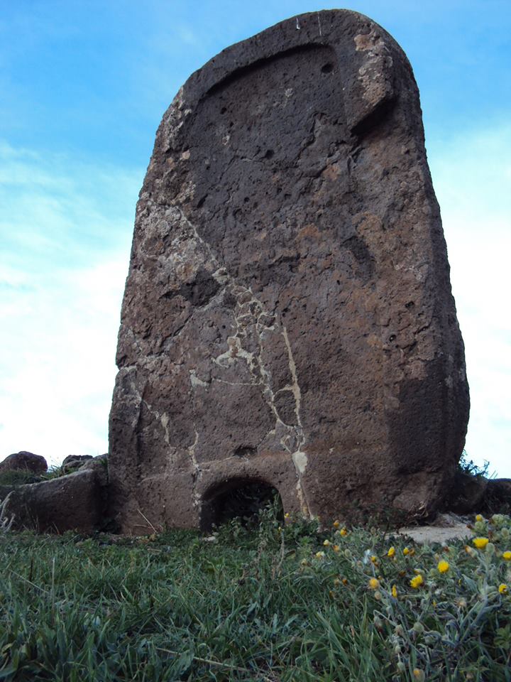 esedra semicircolare orientata a SE, delimitata da grandi lastroni ortostatici; corpo allungato (lun. m.6.15–lar. m.3 all’innesto con l’esedra – e 2 m. nel tratto terminale) con camera funeraria di m.4.43 di lung. e m.0.55 di larg. Al centro dell’esedra è visibile, veramente maestosa, la parte inferiore della stele centinata bilitica (largh.1.10 – spess. 0.22) con portello trapezoidale (largh. 0.24 – alt. 0.20). Un altro frammento centinato della stele si trova rovesciato sulla tomba.