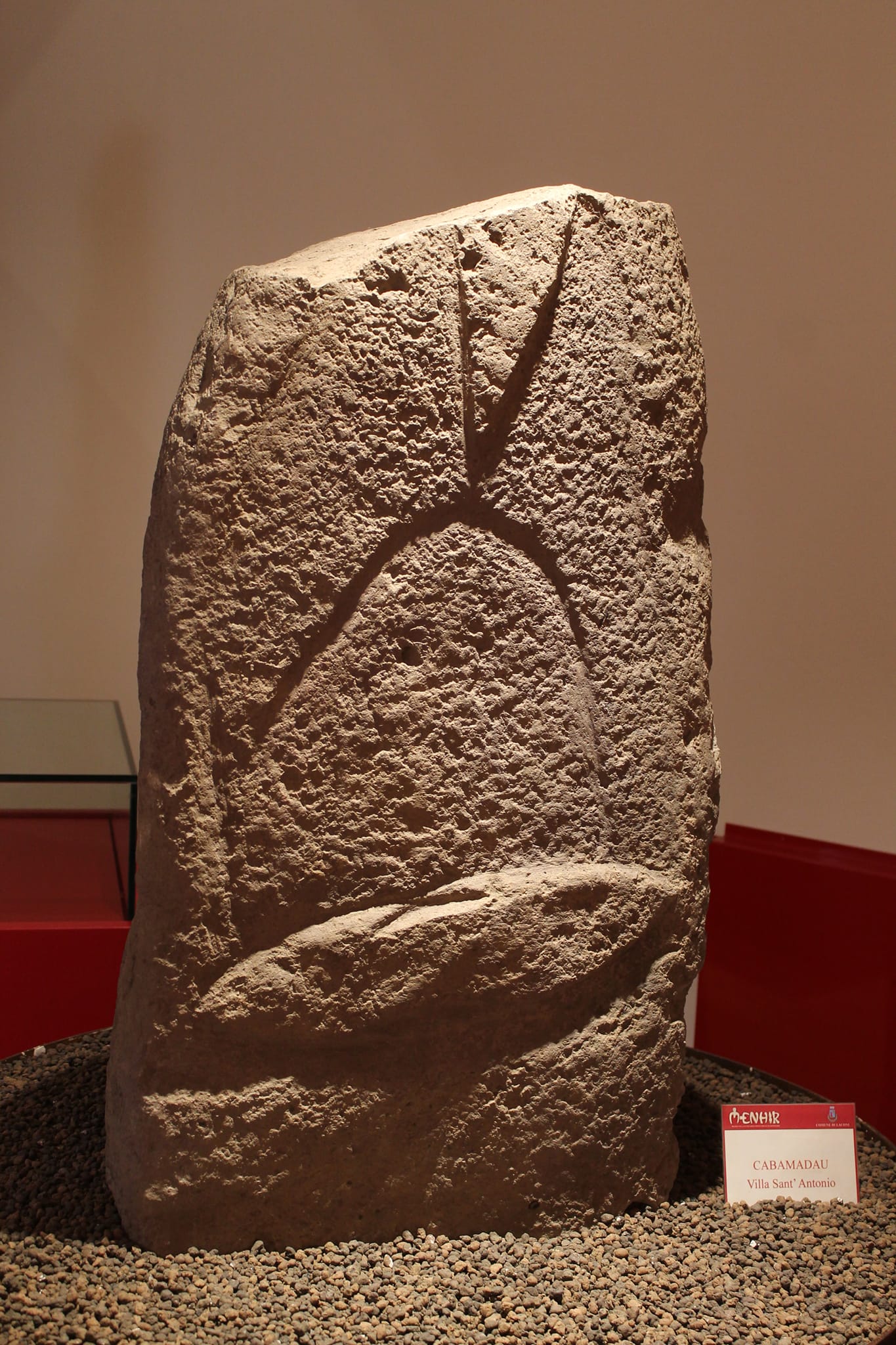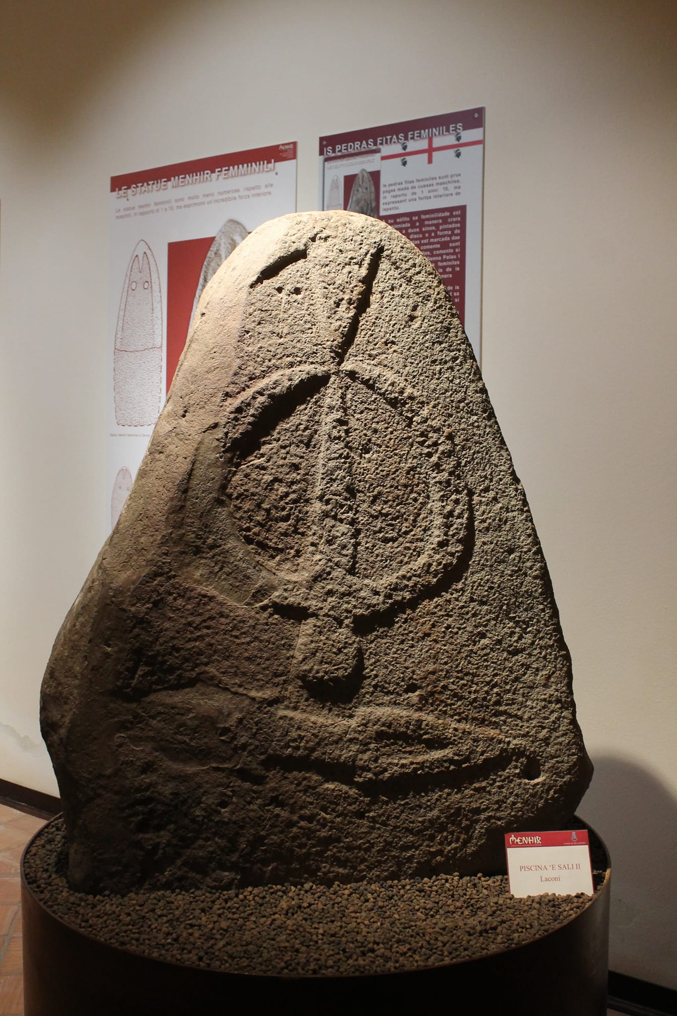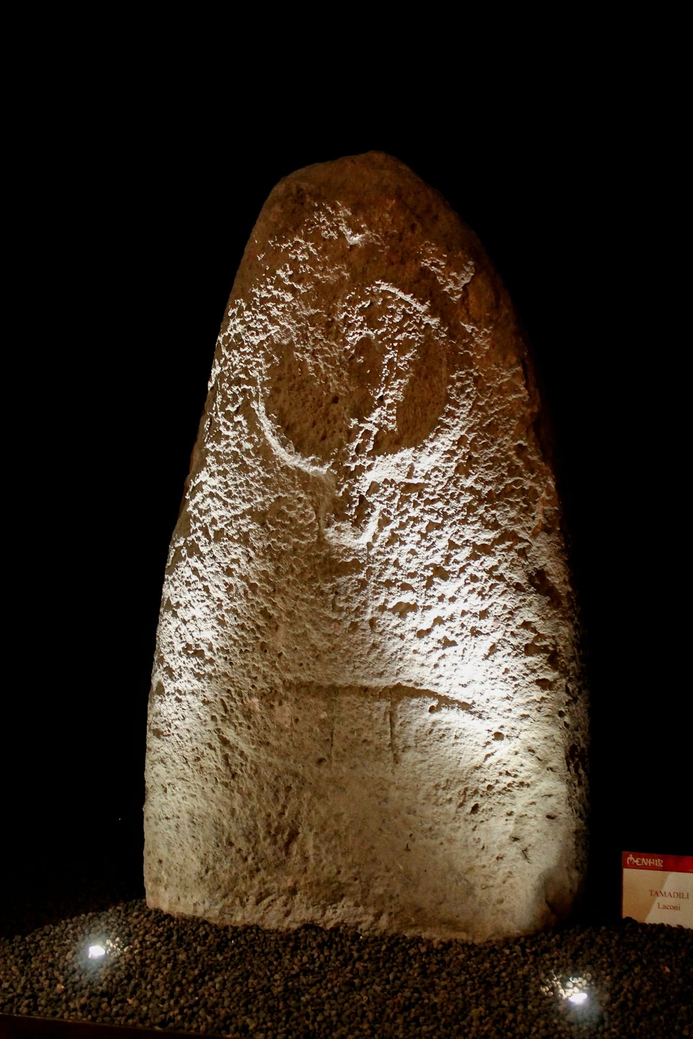 La scoperta delle statue menhir custodite nel museo Aymerich a Laconi, prende avvio dal primo rinvenimento a Genna Arrèle, cui seguirono ritrovamenti numerosi ed eccezzionali in questo e altri siti. Queste “statue stele” presentano sul prospetto diversi motivi scolpiti, i più conosciuti dei quali sono interpretati come il “capovolto” (l’anima del defunto che ritorna alla madre terra) e il pugnale a doppia lama o “bipenne”