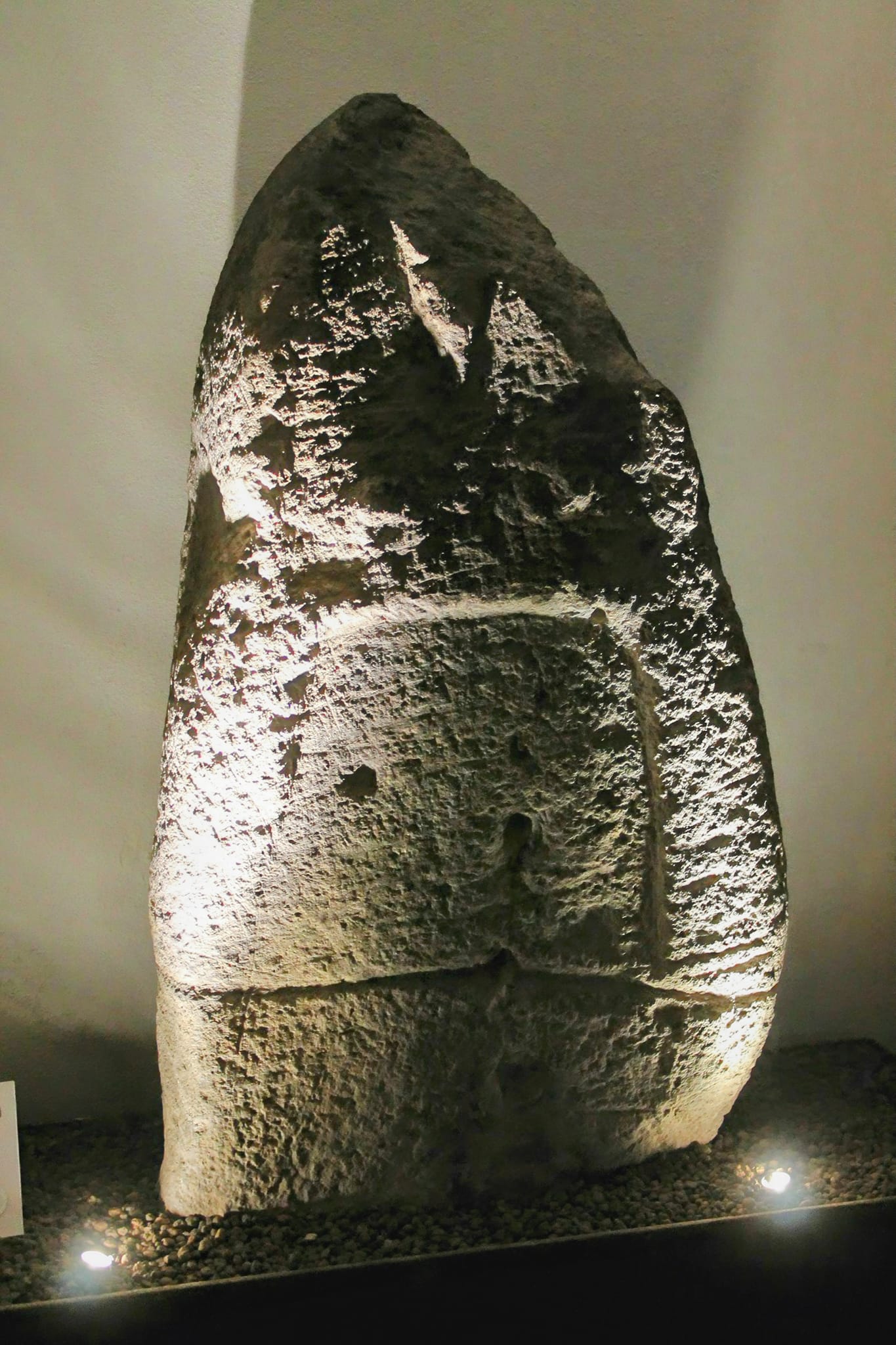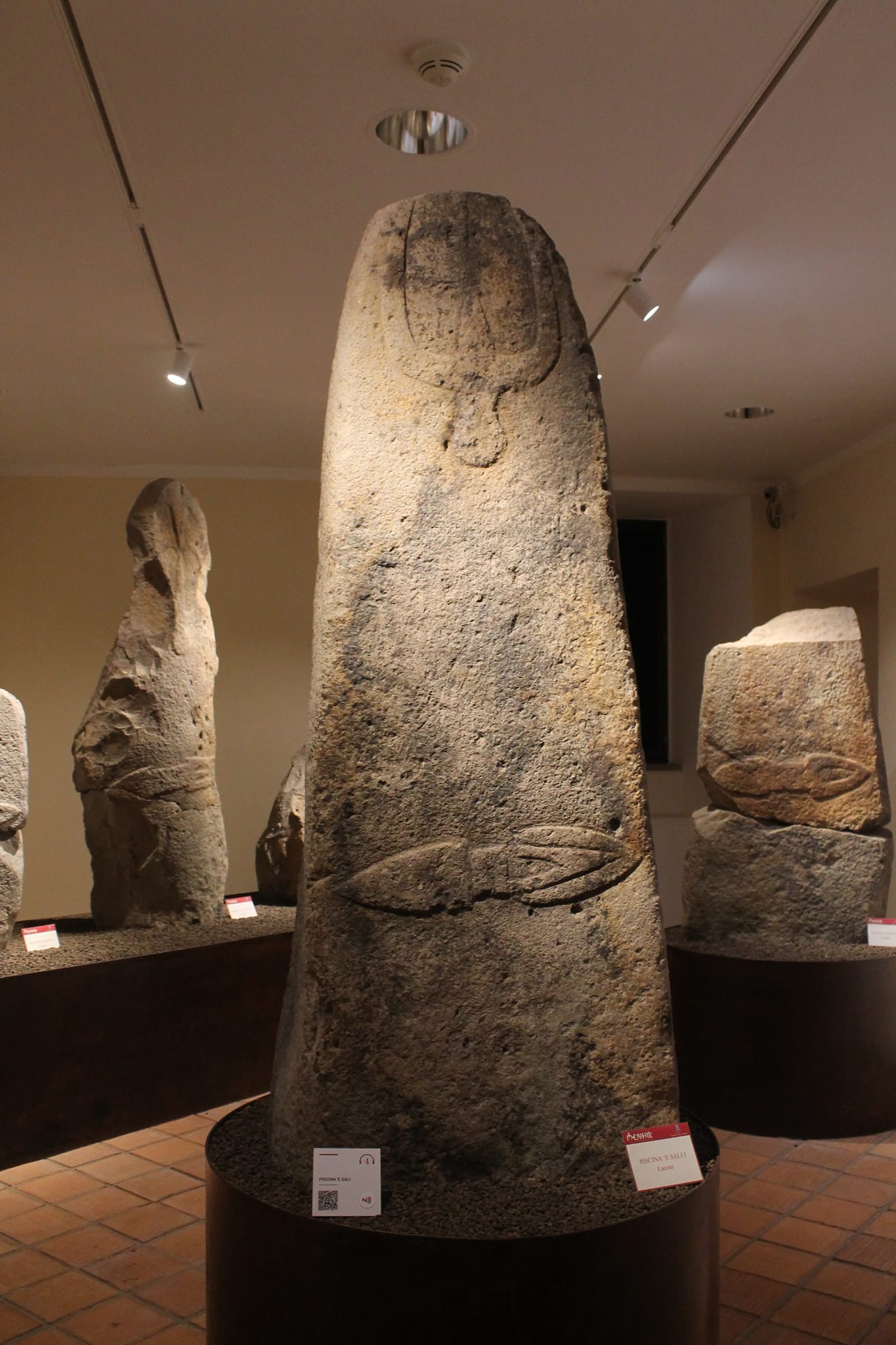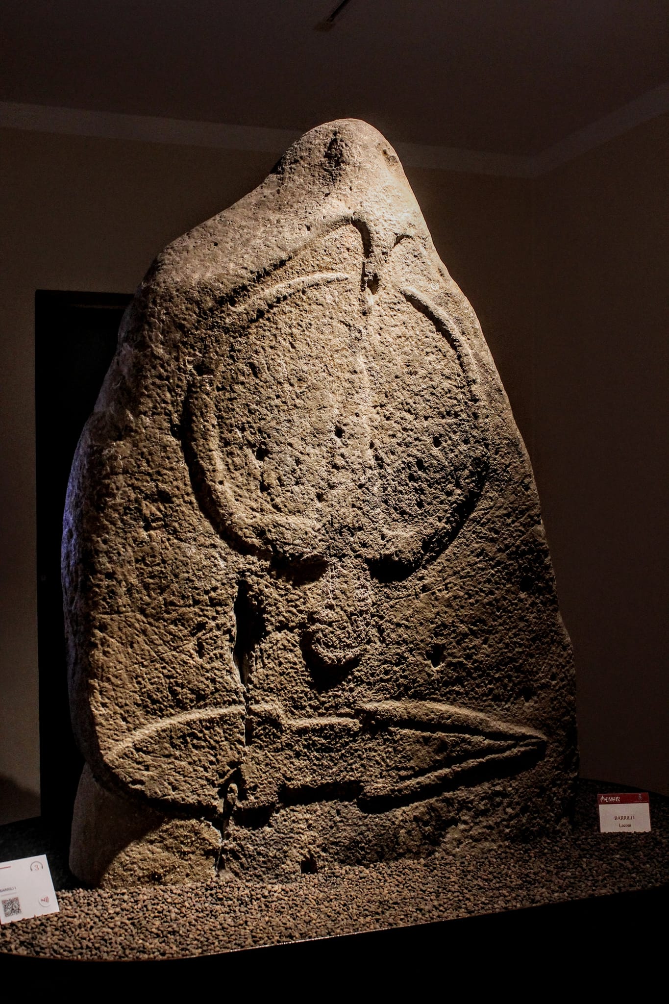 La scoperta delle statue menhir custodite nel museo Aymerich a Laconi, prende avvio dal primo rinvenimento a Genna Arrèle, cui seguirono ritrovamenti numerosi ed eccezzionali in questo e altri siti. Queste “statue stele” presentano sul prospetto diversi motivi scolpiti, i più conosciuti dei quali sono interpretati come il “capovolto” (l’anima del defunto che ritorna alla madre terra) e il pugnale a doppia lama o “bipenne”