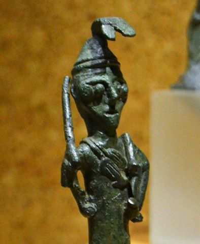 Segni particolari: il bronzetto è molto danneggiato (arti superiori mancanti, pennacchio danneggiato, etc.), tuttavia si nota ancora chiaramente il particolare della legatura della maschera bellica che ricorda molto il sistema di fissaggio con fasce di stoffa usato per le maschere dei cavalieri della Sartiglia di Oristano