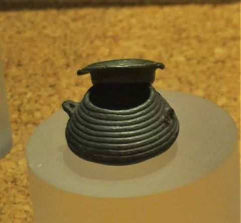 Curiositá: il minuscolo vasetto bronzeo imita un cesto di fibra vegetale.