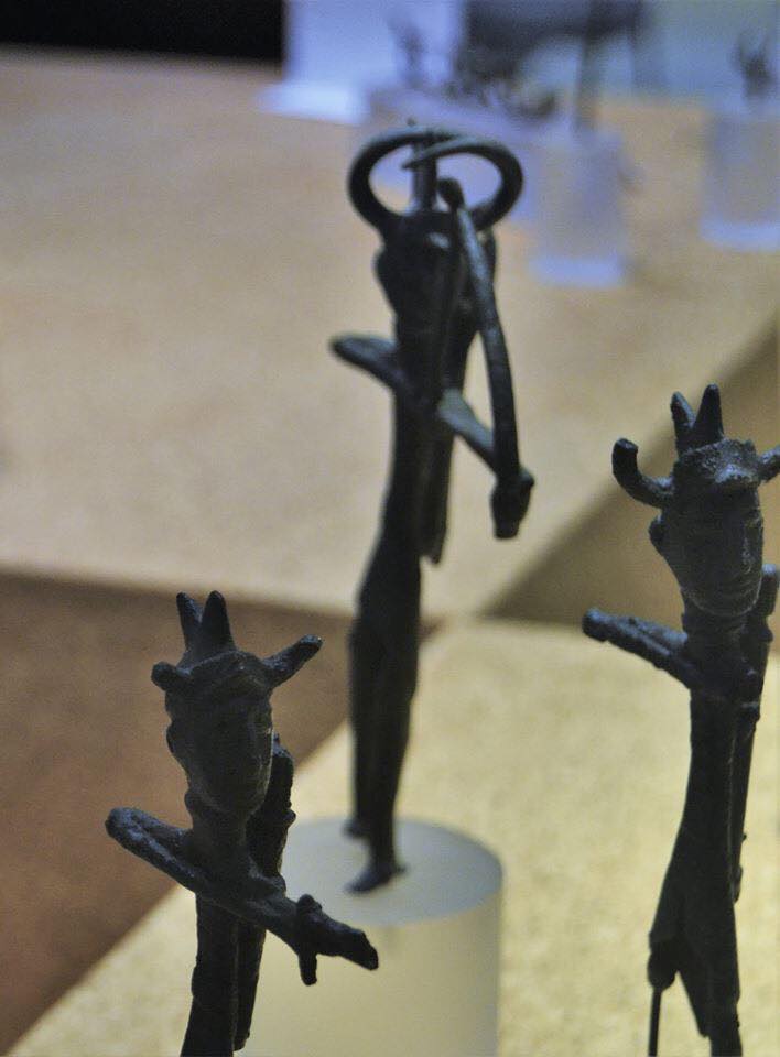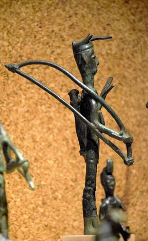 Curiositá: il bronzetto più integro (che si distingue dagli altri per il copricapo complesso ancora integro con corna che si ripiegano al centro sopra la cresta mediana) sulle spalle reca un gruppo di tre oggetti d’arme: un vasellino (forse per il grasso con cui ungere la corda), la lunga faretra per contenere le frecce, la spada con elsa terminante in forma di forcella semilunata. Al di sopra del gruppo vi é una specie di nastro metallico che gira ad arco (un tendiarco?)