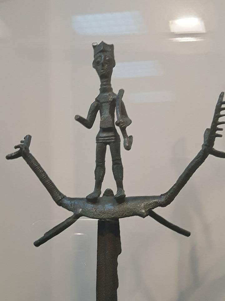 Curiositá: la spada originaria é stata sostituita, durante un restauro negli anni ’60, con altra spada che mostra il tallone immerso nel bolo di piombo che la fissava alla pietra di offerta. Anche la spada originaria sicuramente aveva la piombatura al tallone perchè fra i 73 stocchi ritrovati nel ripostiglio di Abini, 22 conservavano la saldatura plumbea che li fissava – con la punta all’insù – alle tavole d’offerta (pietre che furono rinvenute sul posto, nell’area di un tempio delle acque).