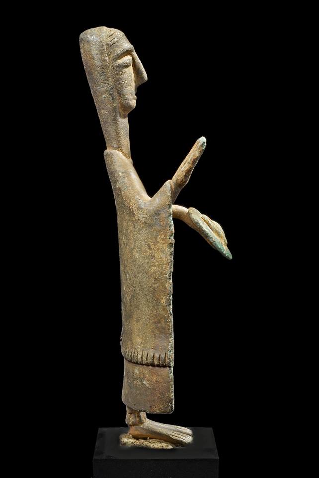 NOTA: il bronzetto fu trafugato e strappato dal contesto originario e (s)venduto a trafficanti d’arte; fortunatamente fu recuperato insieme ad altri reperti (in foto: un arciere e una navicella) grazie all’opera investigativa di Roberto Lai e consegnato alla Soprintendenza di Cagliari