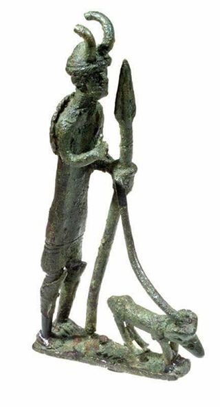 Guerriero con elmo cornuto a calotta, scudo sulle spalle, nella mano sinistra impugna una lancia e una corda con cui trattiene un animale, probabilmente un ariete o un muflone. Con la mano destra porge il saluto devozionale.