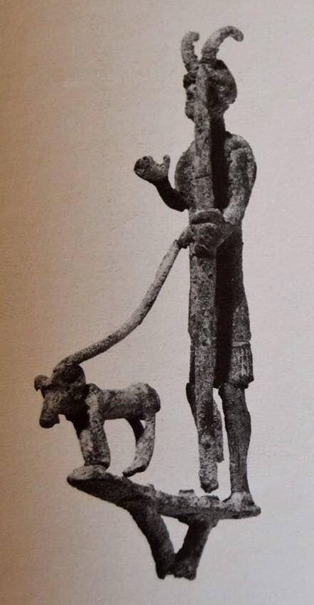 Oppure… la seconda figura “potrebbe essere un ariete stretto tra le gambe dell’uomo in piedi, con un cane che lo morde al garrese 🙂 e l’uomo stante avrebbe in mano un pannetto come in altro bronzetto, un’offerta.