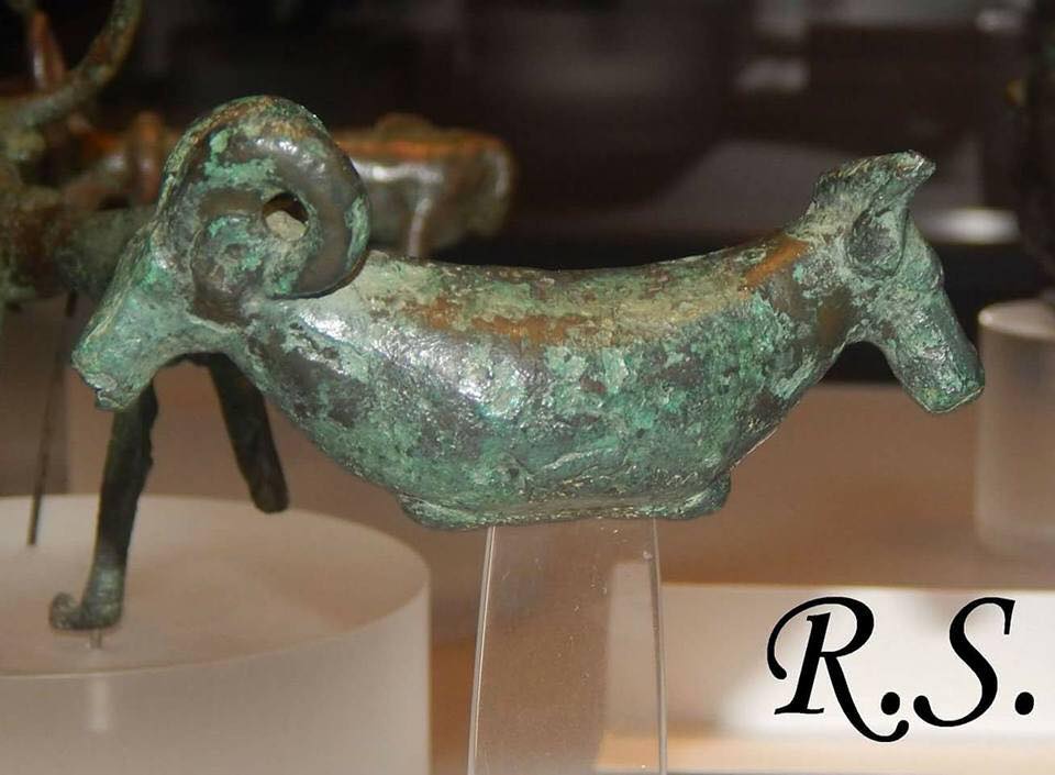 – la testa del muflone è più curata, con occhi a globetto più grandi, bocca più marcata nel taglio, con il giro delle corna raccolto e geometrico, senza rigature viste in altro bronzetto di muflone.