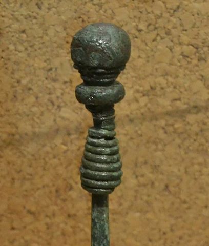Aspetto: la verga ha sezione quadrangolare e si allarga verso la parte inferiore per poi restringersi verso la punta. La capocchia massiccia termina con un pomello emisferico, con una scozia sottostante, guarnita da tre rilievi ad anello, che la separa dal toro; sotto la decorazione a toro, la verga è rivestita da un avvolgimento a spirale di filo di bronzo che si allarga verso la base.
