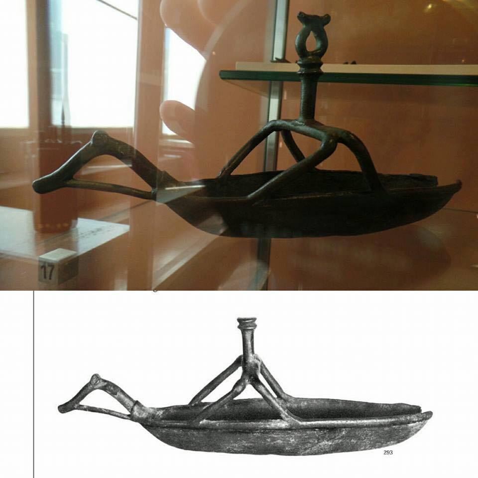 La navicella schedata e fotografata da G. Lilliu nel 1966 (vedi immagine in bianco e nero) appariva mancante dell’anello posto in sommità. Tuttavia Lilliu a quel tempo aveva visionato una fotografia eseguita nel 1957 da Lo Porto in cui appariva l’anello sommitale con colombina (o altro volatile) con il capo rivolto verso poppa. Egli quindi aveva potuto descriverla pur segnalando che forse l’elemento “è da considerarsi per sempre perduto”.