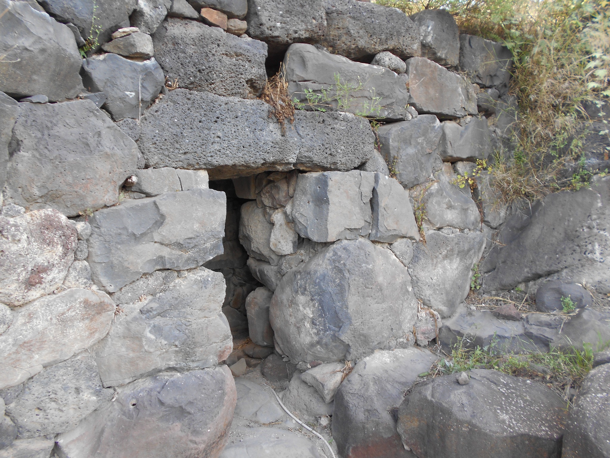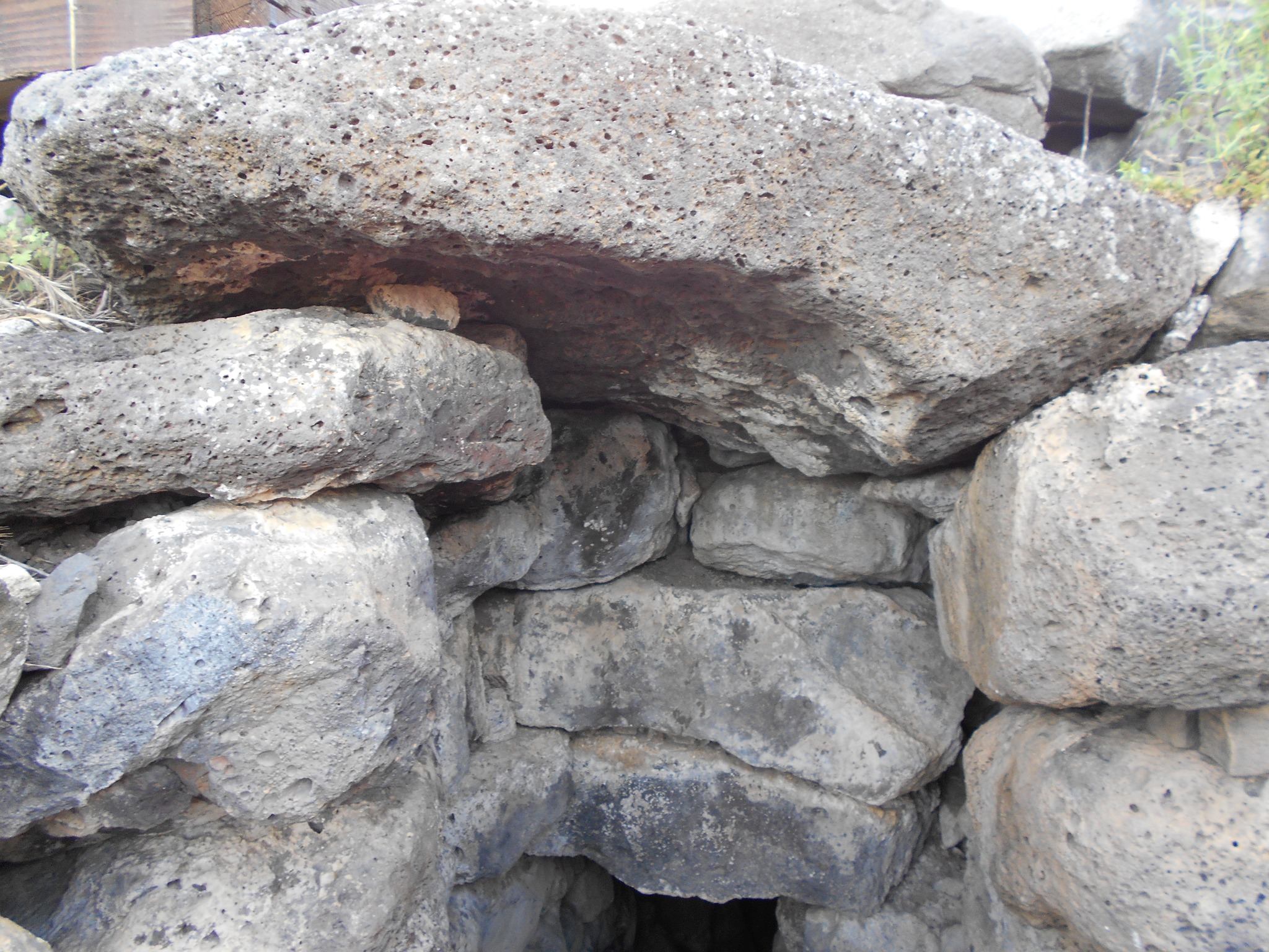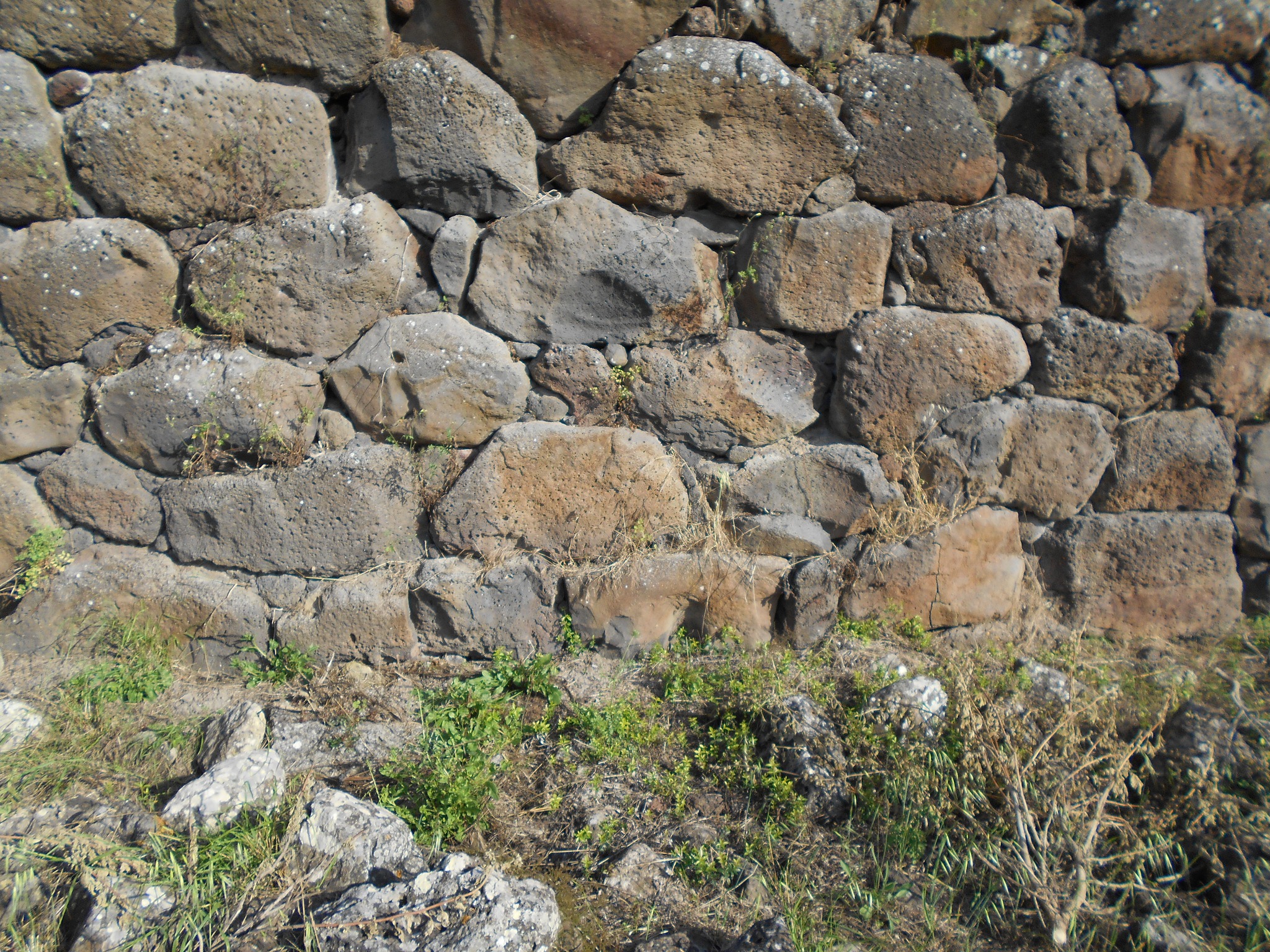 Sono visibili fino a 3 filari sul lato ovest del monumento, mentre sugli altri lati se ne intravedono 1 o 2. I conci sono enormi, in basalto. Non si esclude che vi siano altri filari sottostanti.