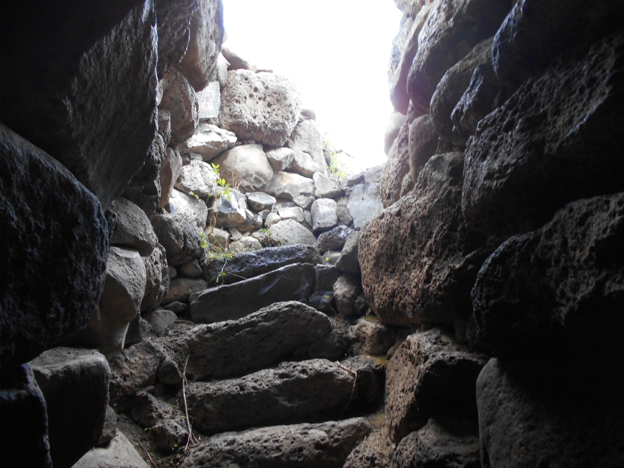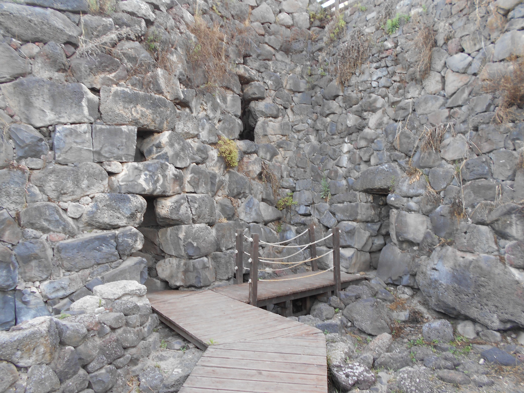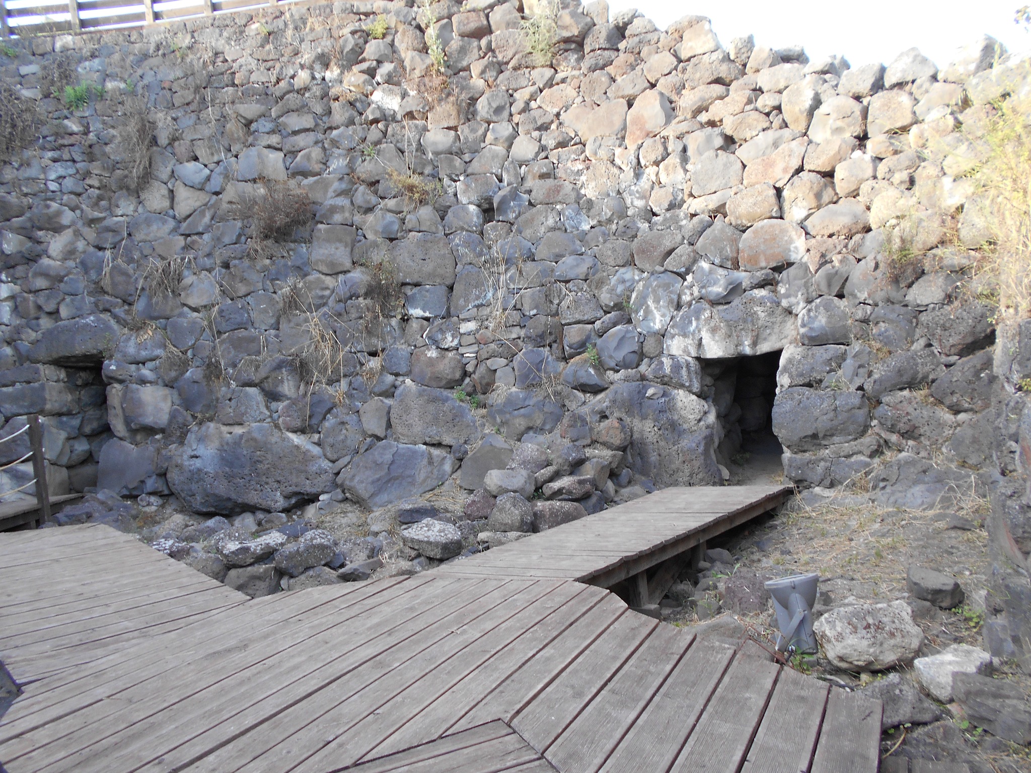 Sono visibili fino a 3 filari sul lato ovest del monumento, mentre sugli altri lati se ne intravedono 1 o 2. I conci sono enormi, in basalto. Non si esclude che vi siano altri filari sottostanti.