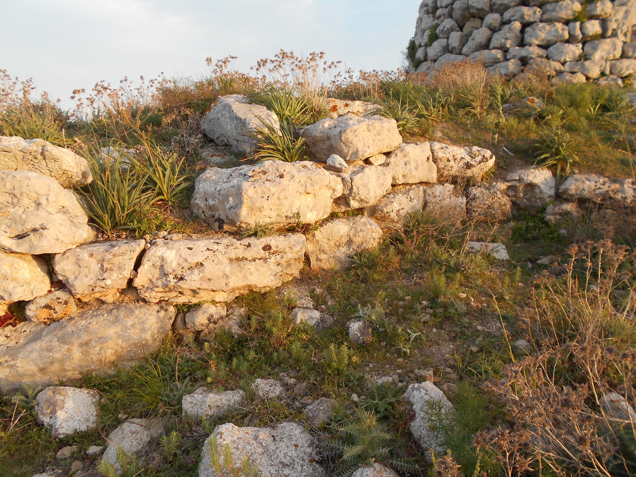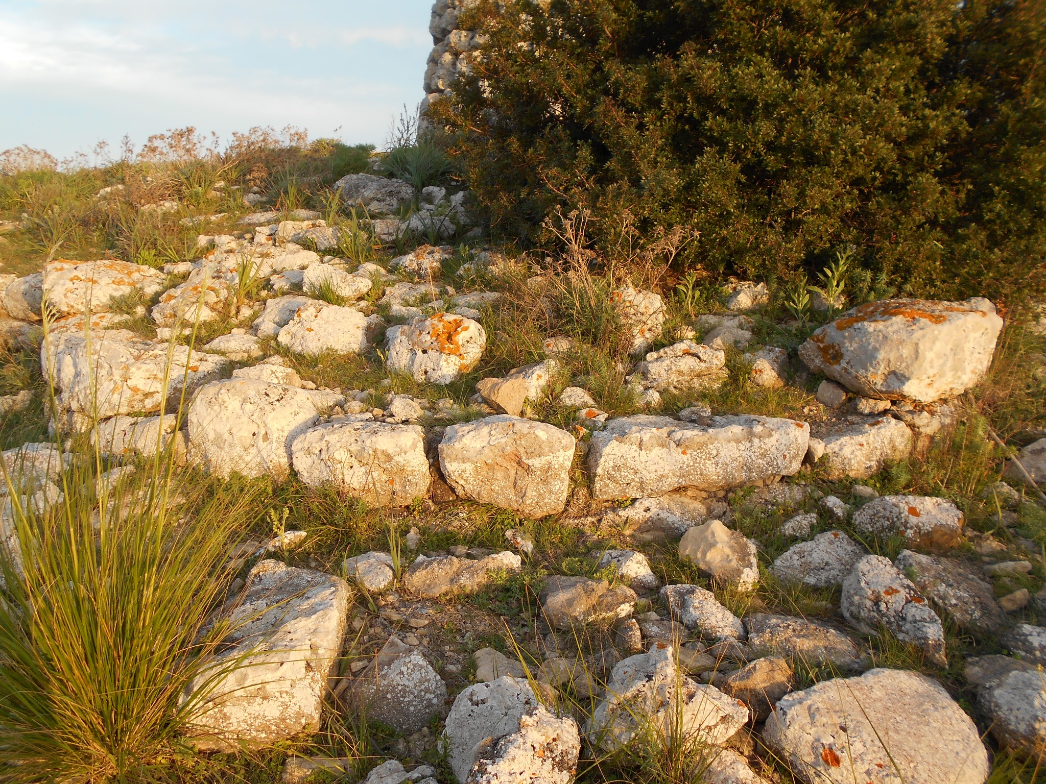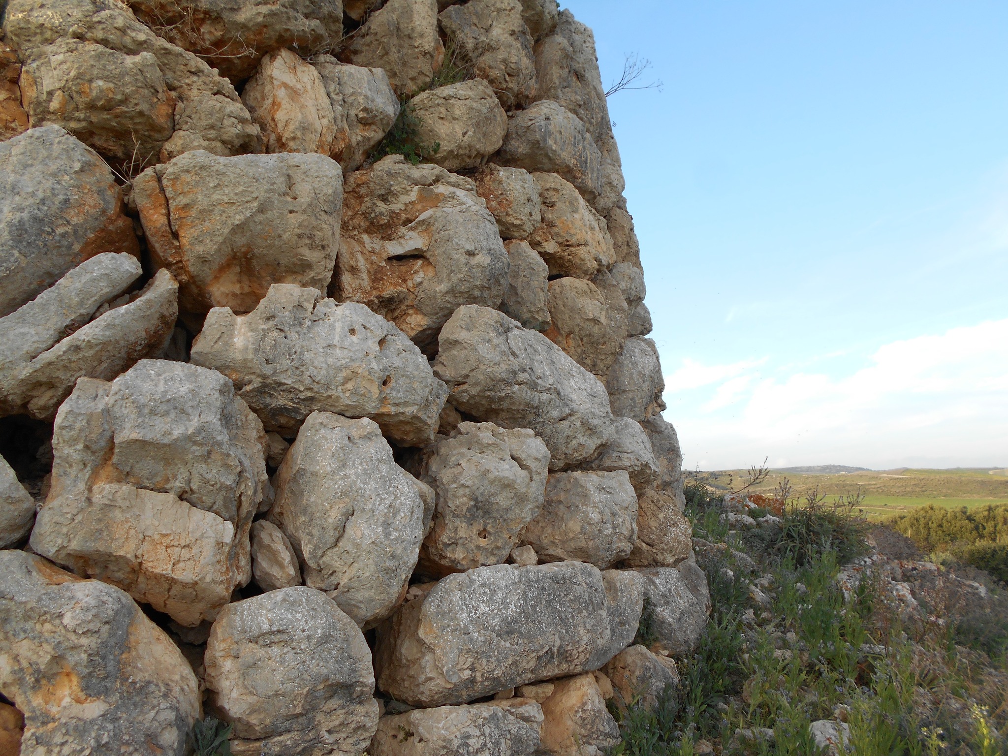Che si tratti di un polilobato lo si vede da muri di collegamento che si diramano dalla torre centrale; ma la vegetazione e la terra rendono illeggibile la planimetria. E’ realizzato con enormi blocchi di marna. Sul lato ovest possiamo ammirare i filari perfettamente circolari, con blocchi lavorati e adattati proprio per ottenere queste curvature perfette.