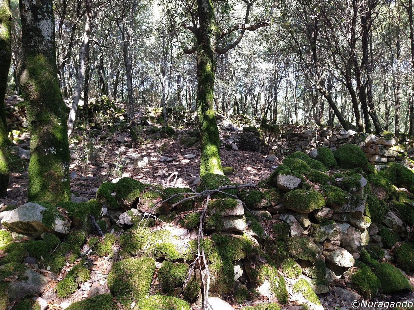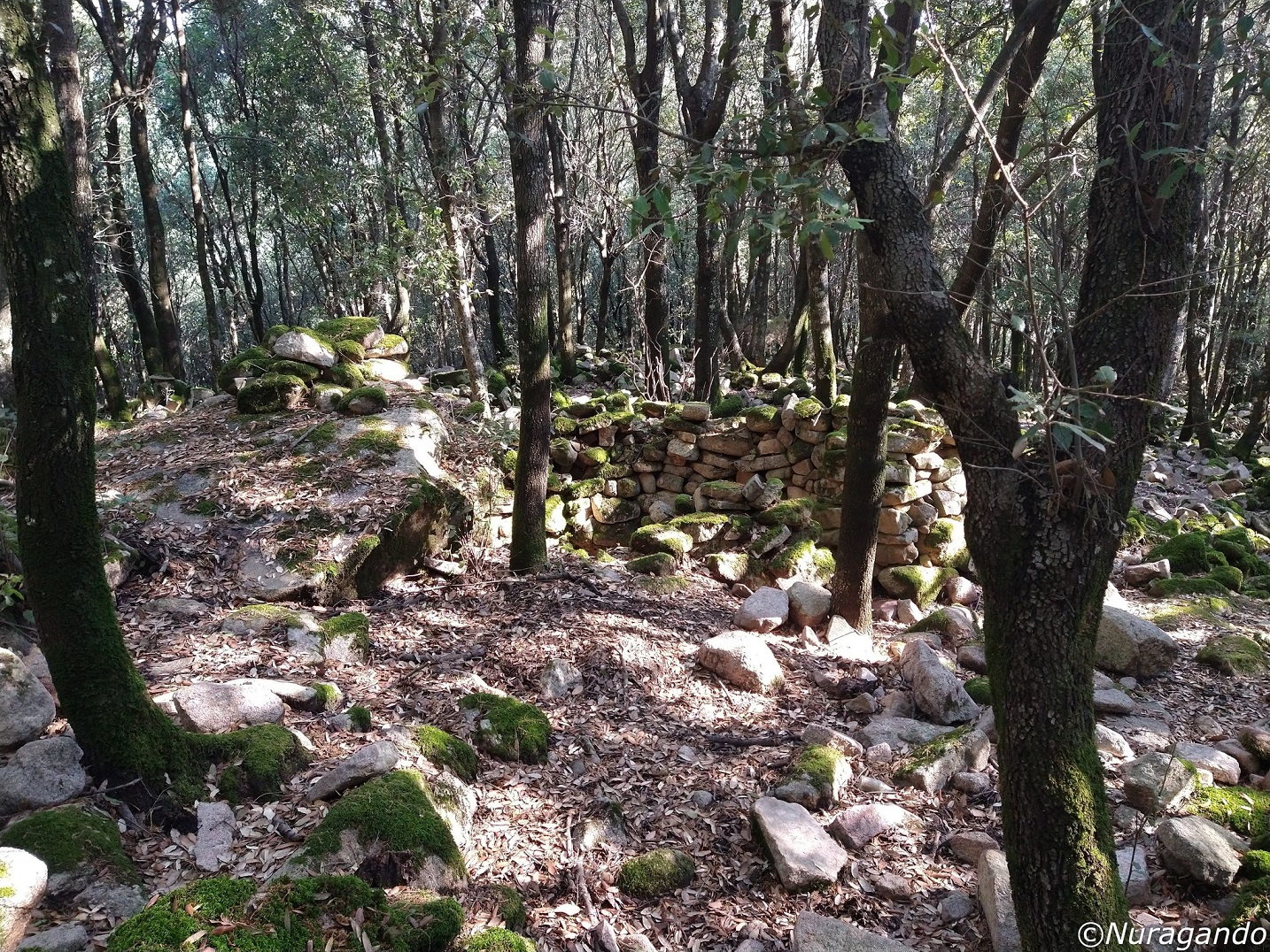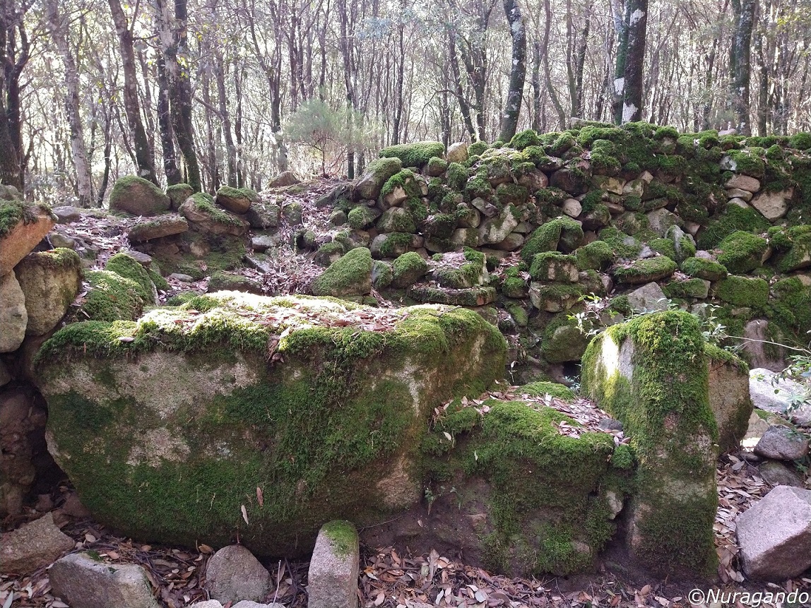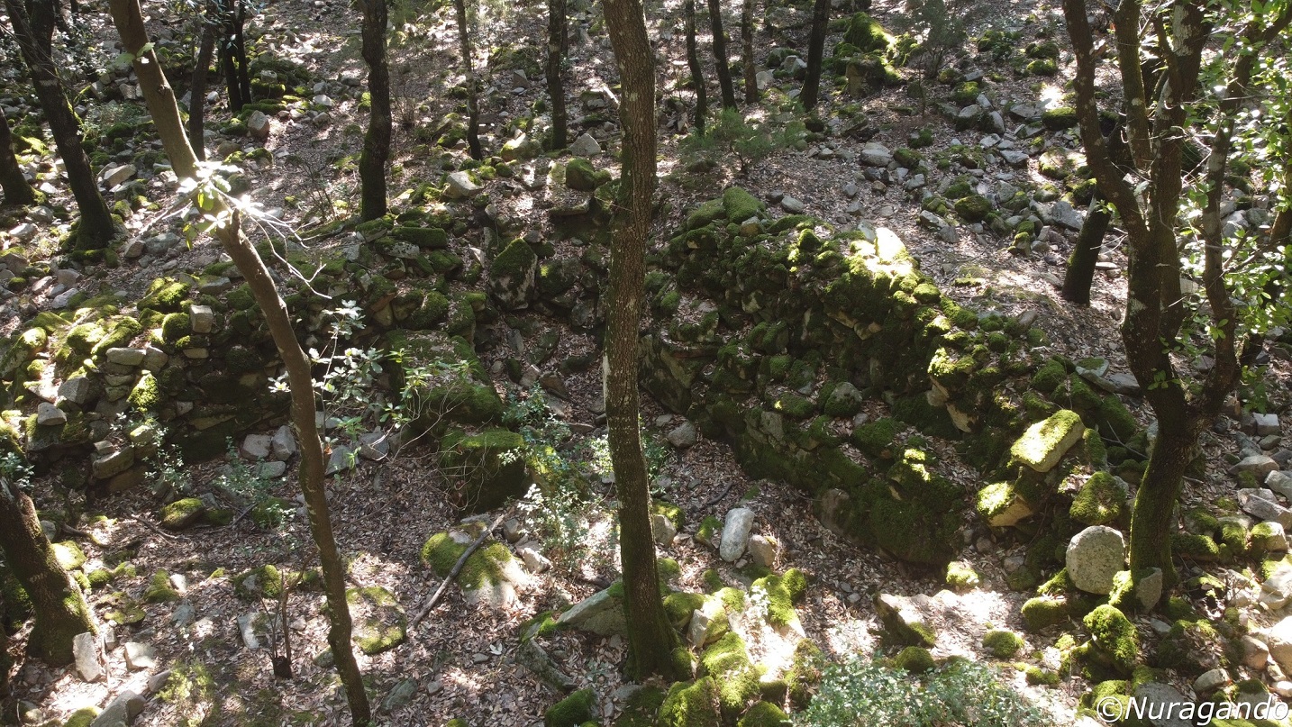 Quasi mimetizzati tra i grandi alberi si notano resti ben visibili di un grande villaggio in pietra, con diverse costruzioni, alcune abitazioni, resti di tombe e altre strutture non meglio identificabili