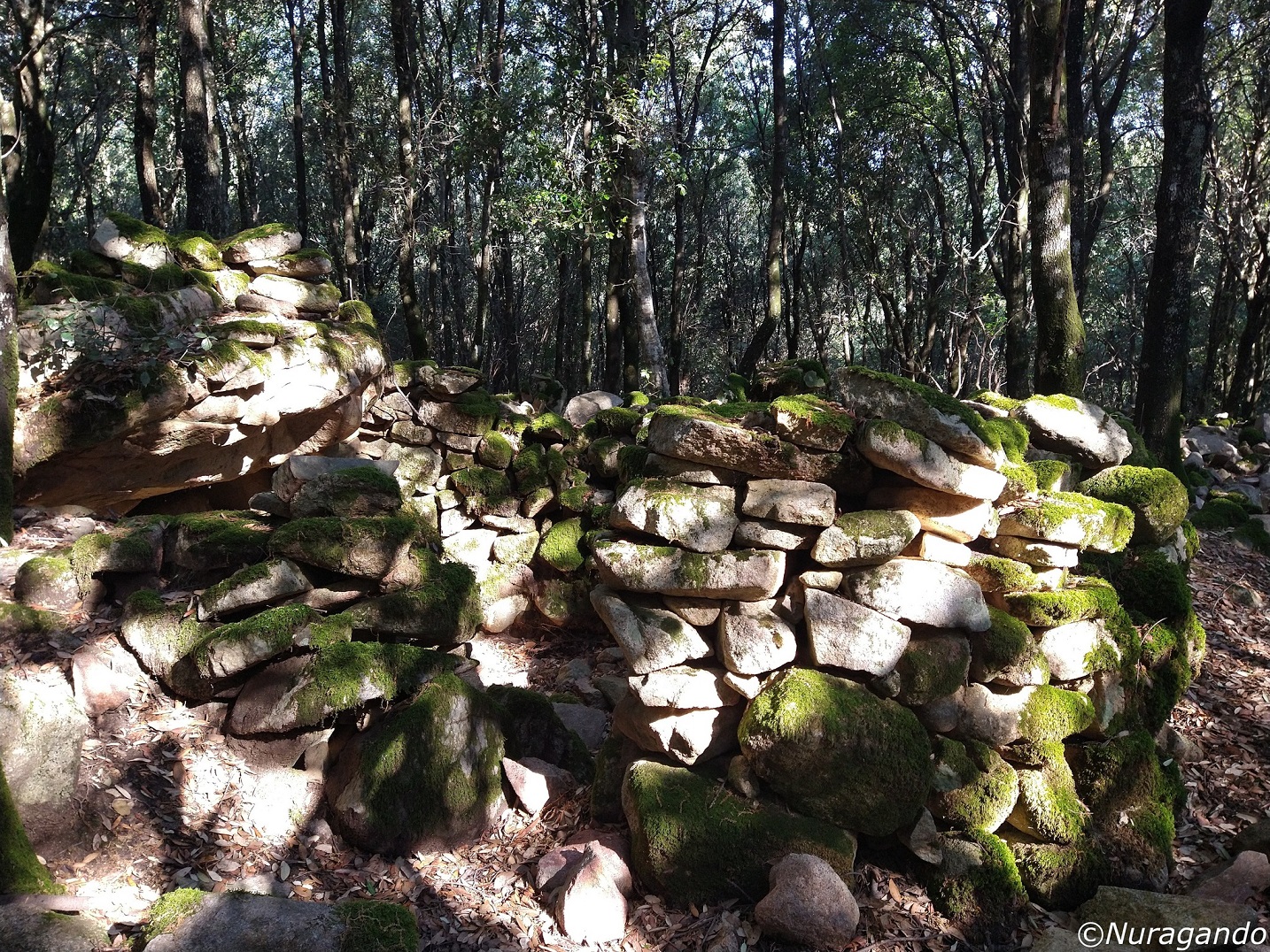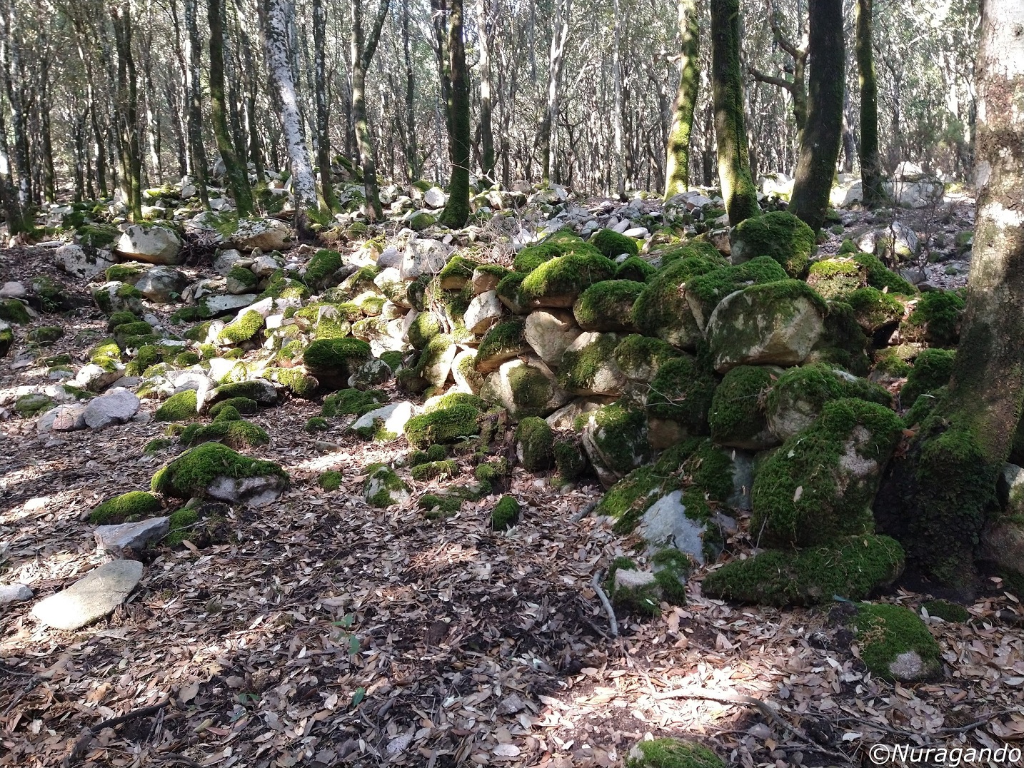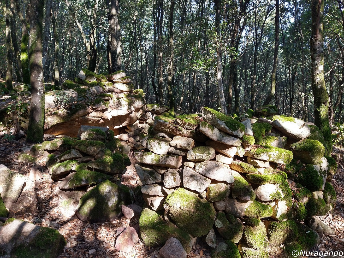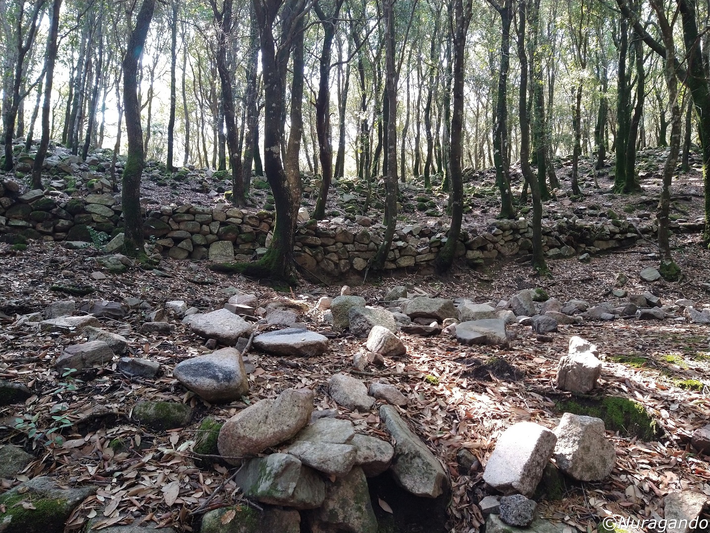 Quasi mimetizzati tra i grandi alberi si notano resti ben visibili di un grande villaggio in pietra, con diverse costruzioni, alcune abitazioni, resti di tombe e altre strutture non meglio identificabili