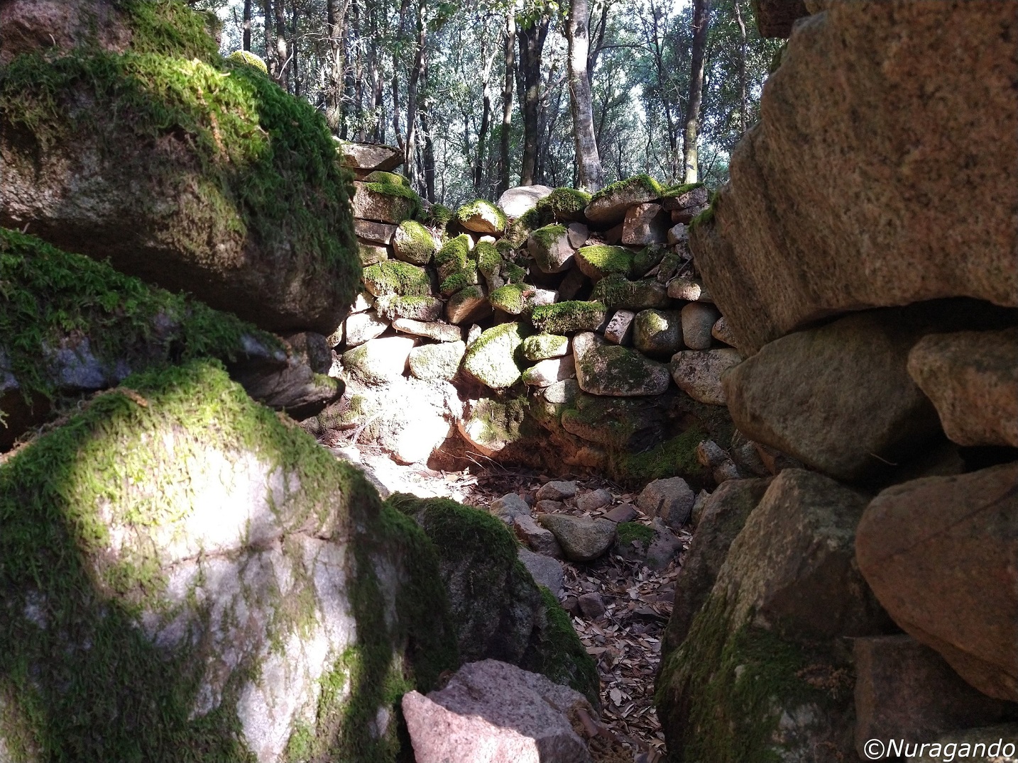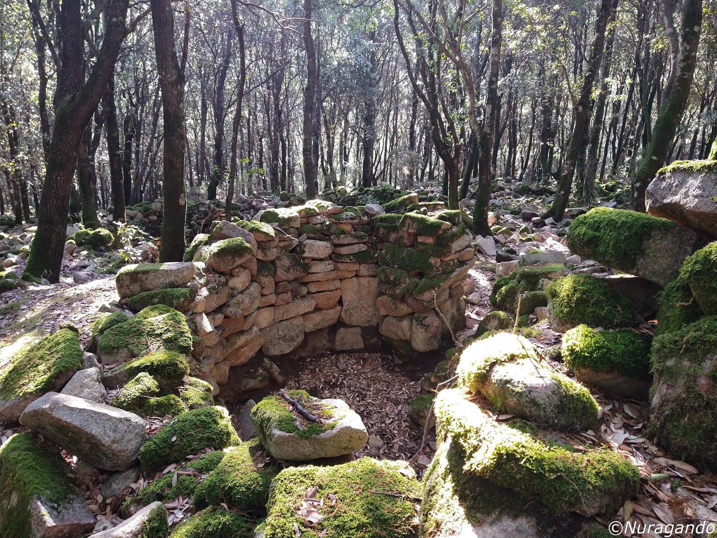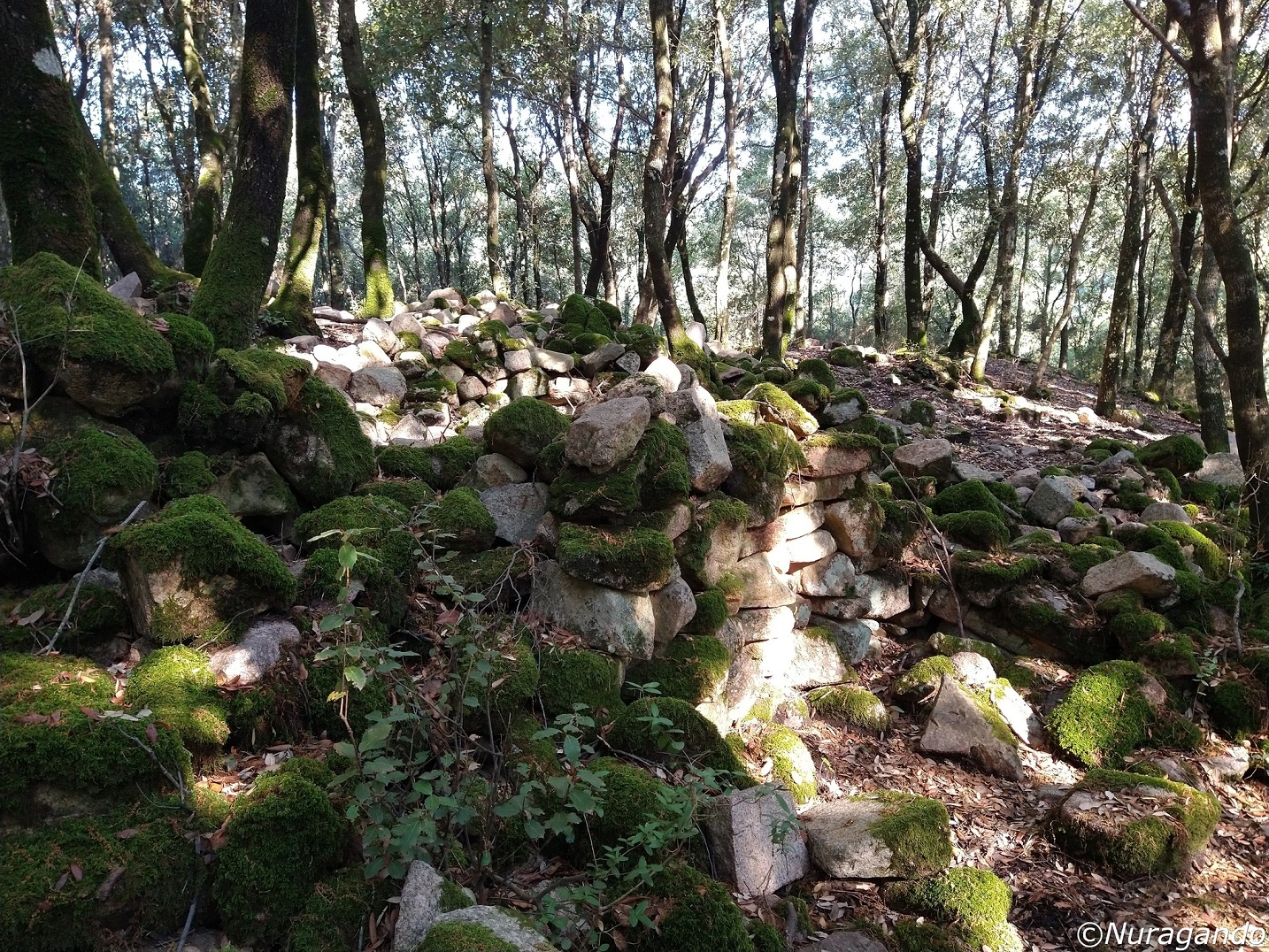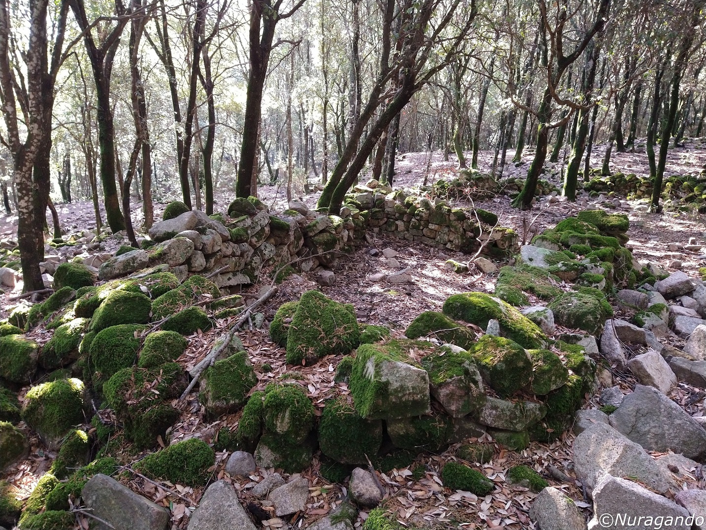 Quasi mimetizzati tra i grandi alberi si notano resti ben visibili di un grande villaggio in pietra, con diverse costruzioni, alcune abitazioni, resti di tombe e altre strutture non meglio identificabili
