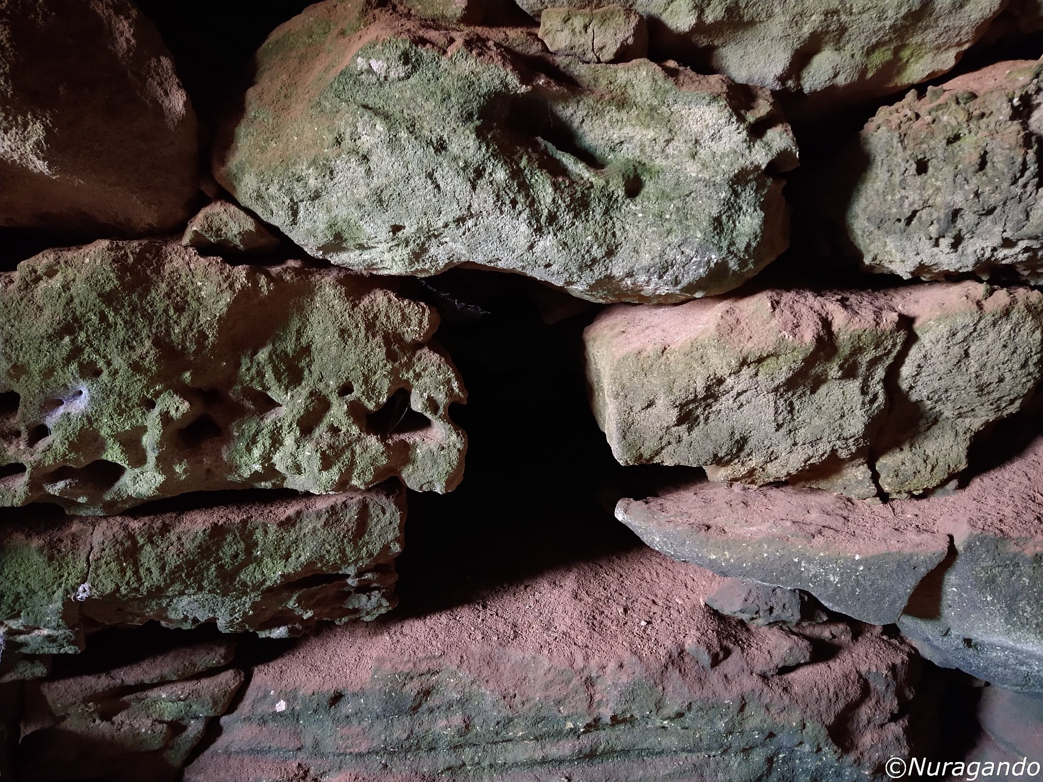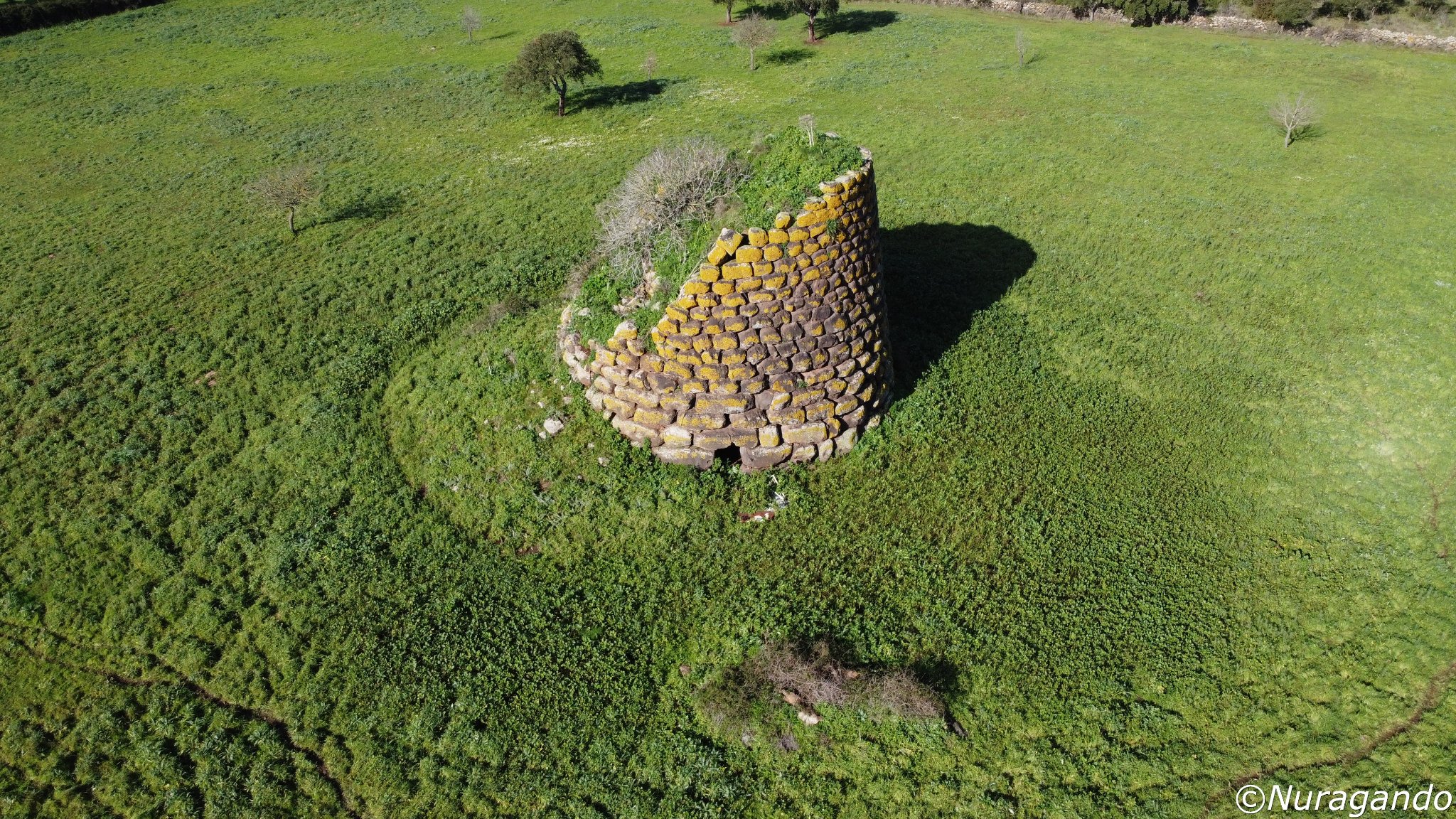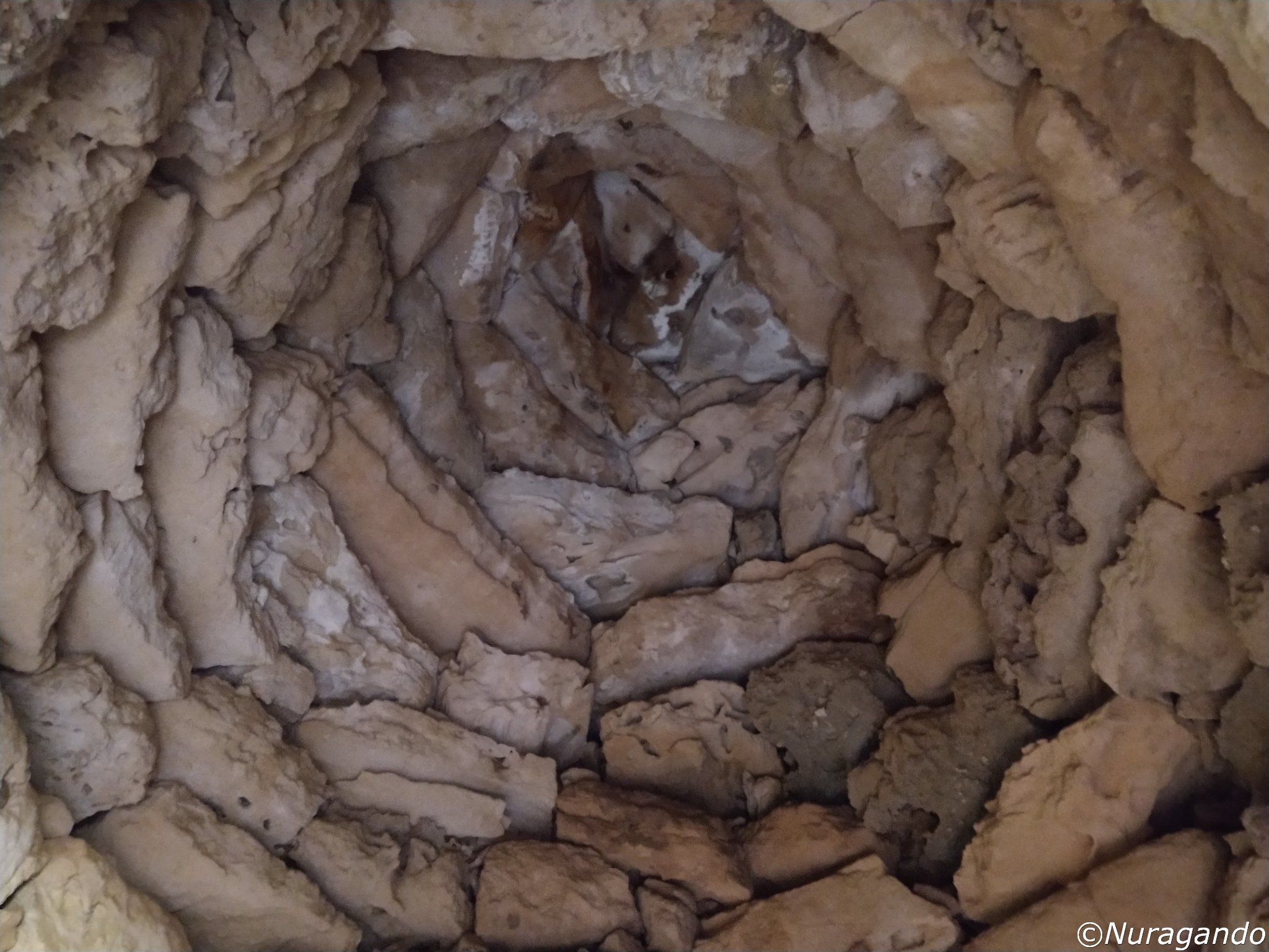 Da un pertugio fra i grossi conci, della parte superiore del paramento esterno si accede al corridoio che era il vano in cui si sviluppava la scala elicoidale che dava accesso alla parte superiore della torre. Infatti il corridoio termina su due grandi architravi totalmente interrati. Il nuraghe appare in pessime condizioni di conservazione. E’ avvolto, in parte da arbusti di lentischio e fichi d’india, la causa dei crolli e dell’interramento, sino a circa due metri dal calpestio.