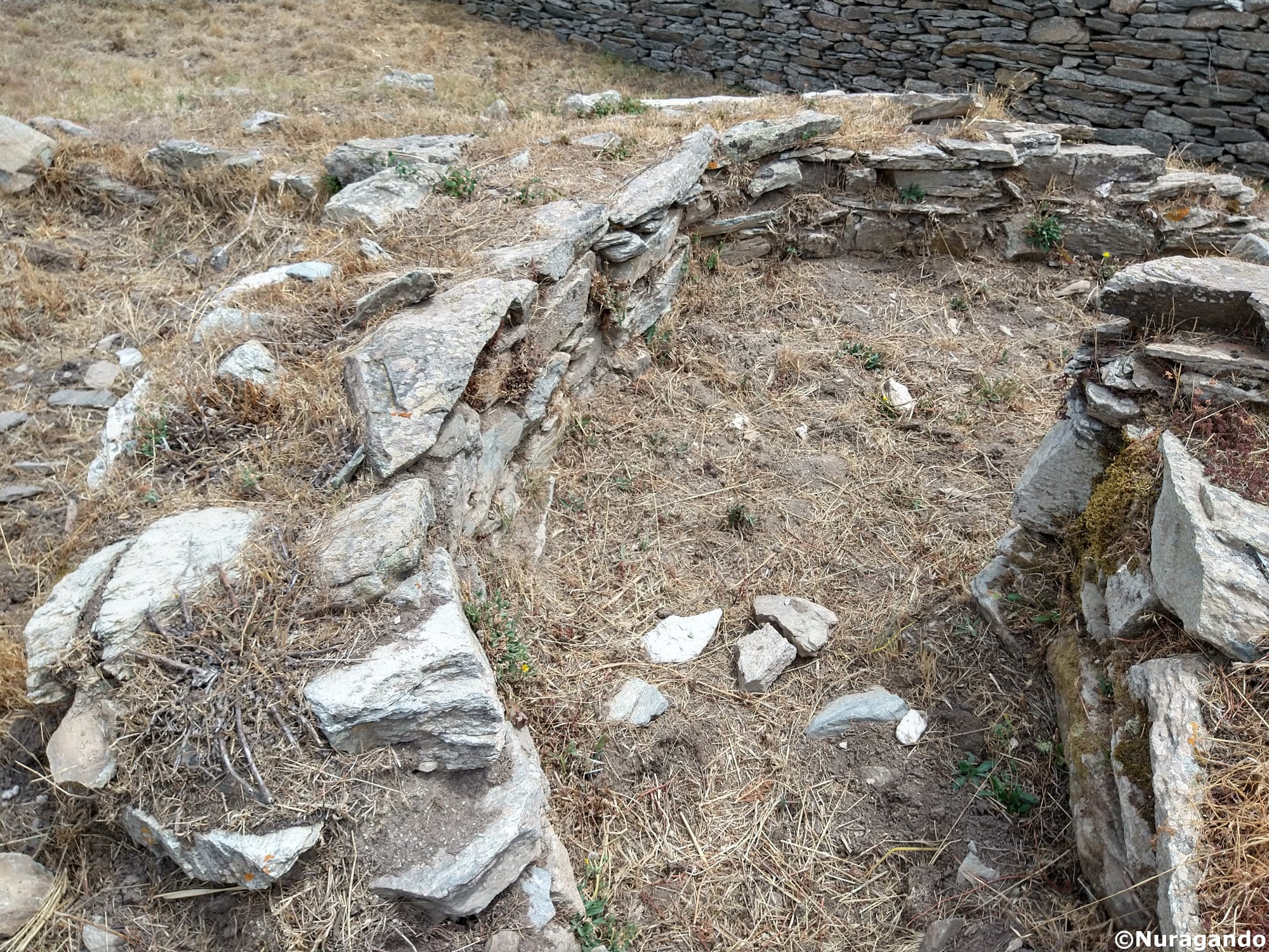 L’edificio è racchiuso entro un recinto ellittico (m 48,50 x 28; spessore murario di m 1,50) ridotto al solo filare di base, con ingresso ad O.
