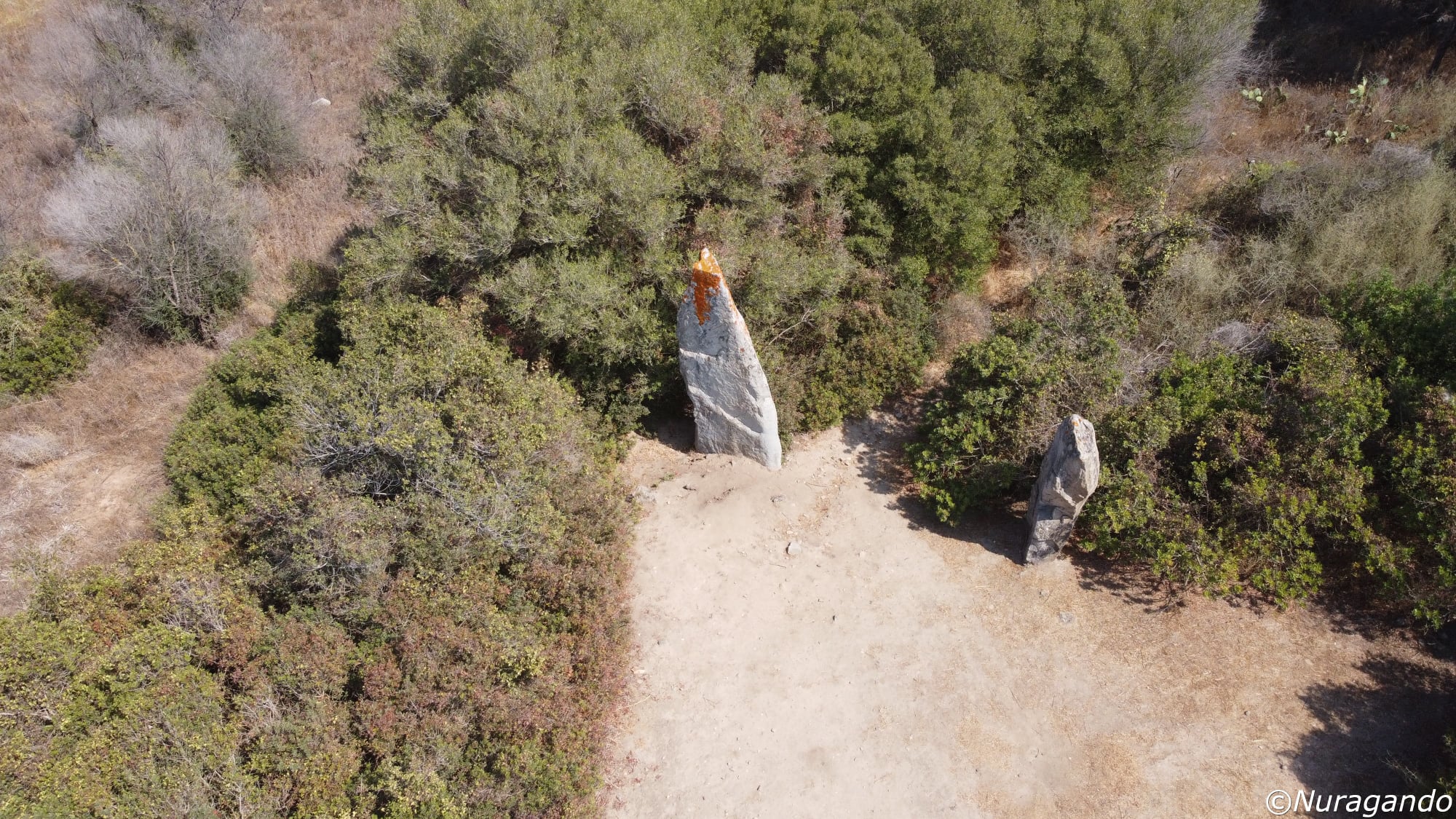 I tre menhir di granito sono ubicati sul pendio dell”insellatura: il primo aniconico (lungh. m 4,25; largh. m 0,98; spessore m 0,60) – appuntito e fratturato in due tronconi – è adagiato sul terreno; il secondo – risollevato negli anni ‘70 – è di tipo protoantropomorfo con forma ogivale e sezione piano-convessa; il terzo , anch”esso protoantropomorfo, ha forma ogivale e sezione piano-convessa schiacciata. due menhir porti frontalmente l”uno all”altro quasi a indicare un passaggio.