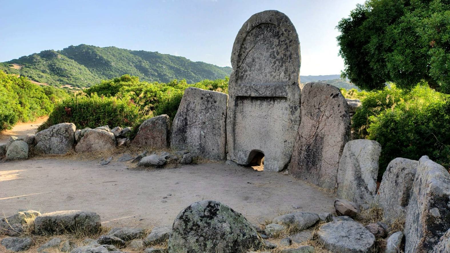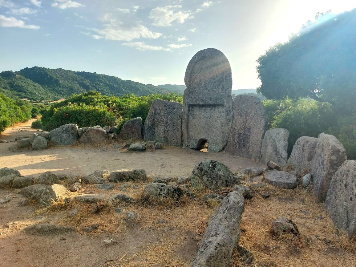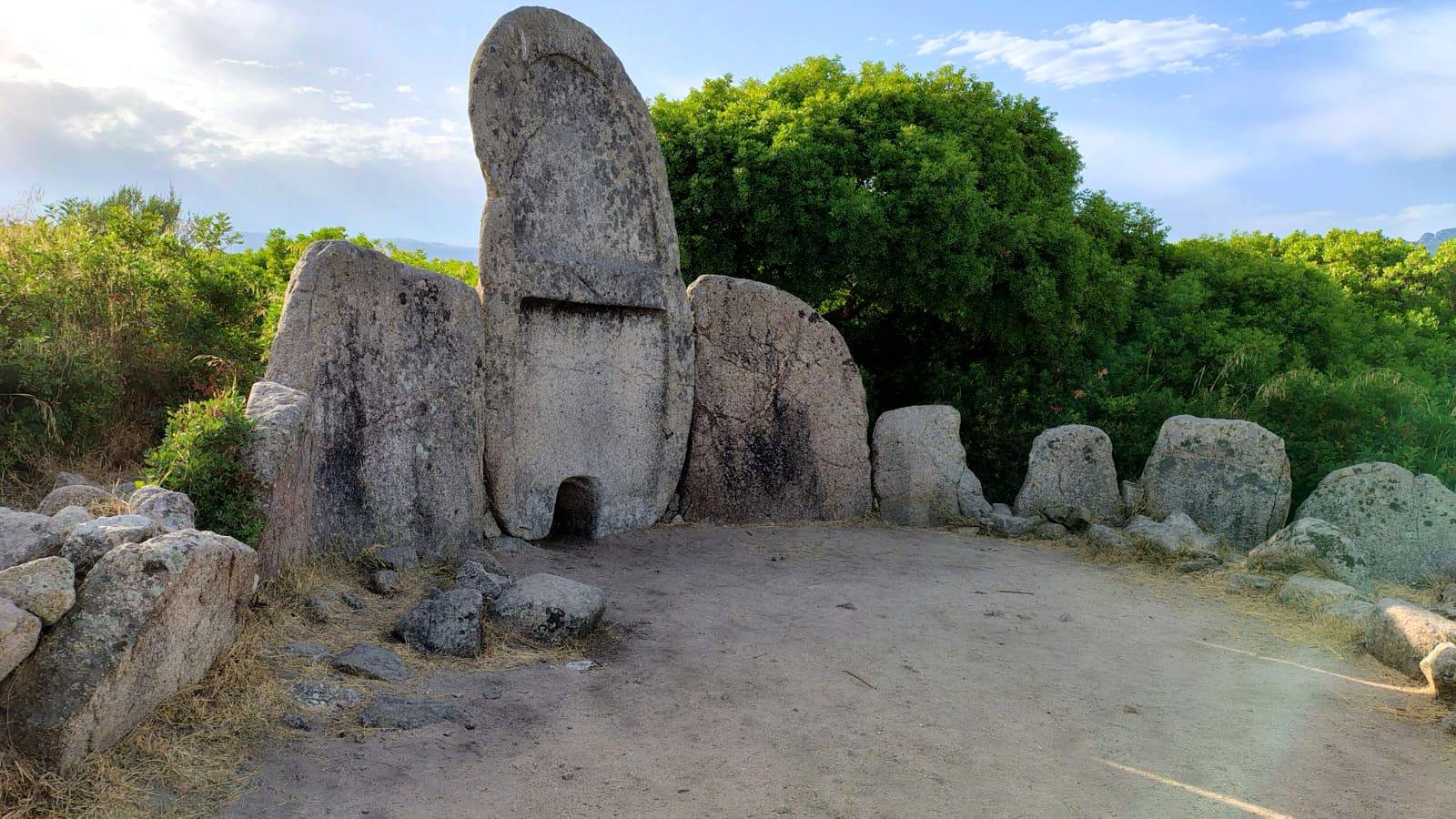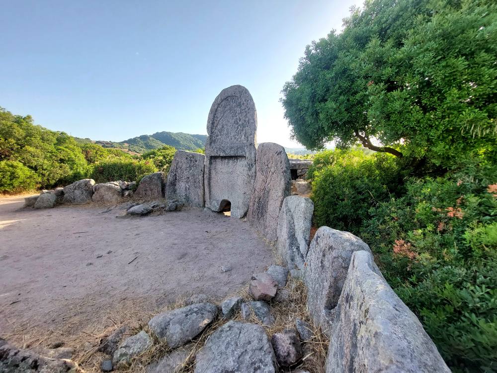 Questa tomba di tipo dolmenico, del periodo del Bronzo Antico, si presenta in ottimo stato di conservazione, infatti conserva quasi intatto il corridoio funebre con copertura a piattabanda, cioè costituita da lastre di pietra disposte orizzontalmente lungo le pareti del corridoio. La grande stele è costituita da un monolite centinato, in cui è scavato il piccolo portello d’accesso alla camera funeraria. L’esedra conserva ancora alcune pietre infisse come erano in origine. (www.ilportalesardo.it)