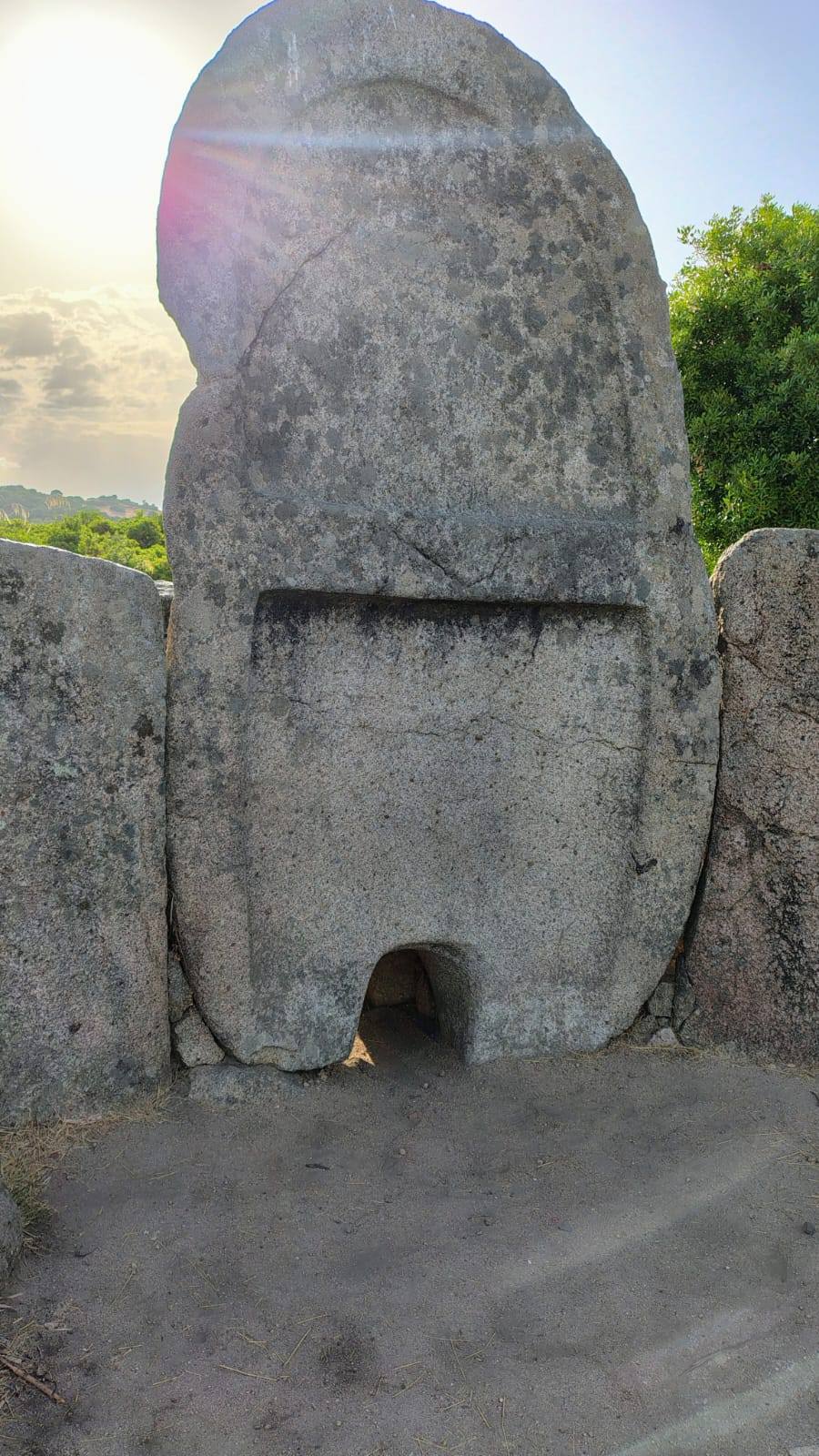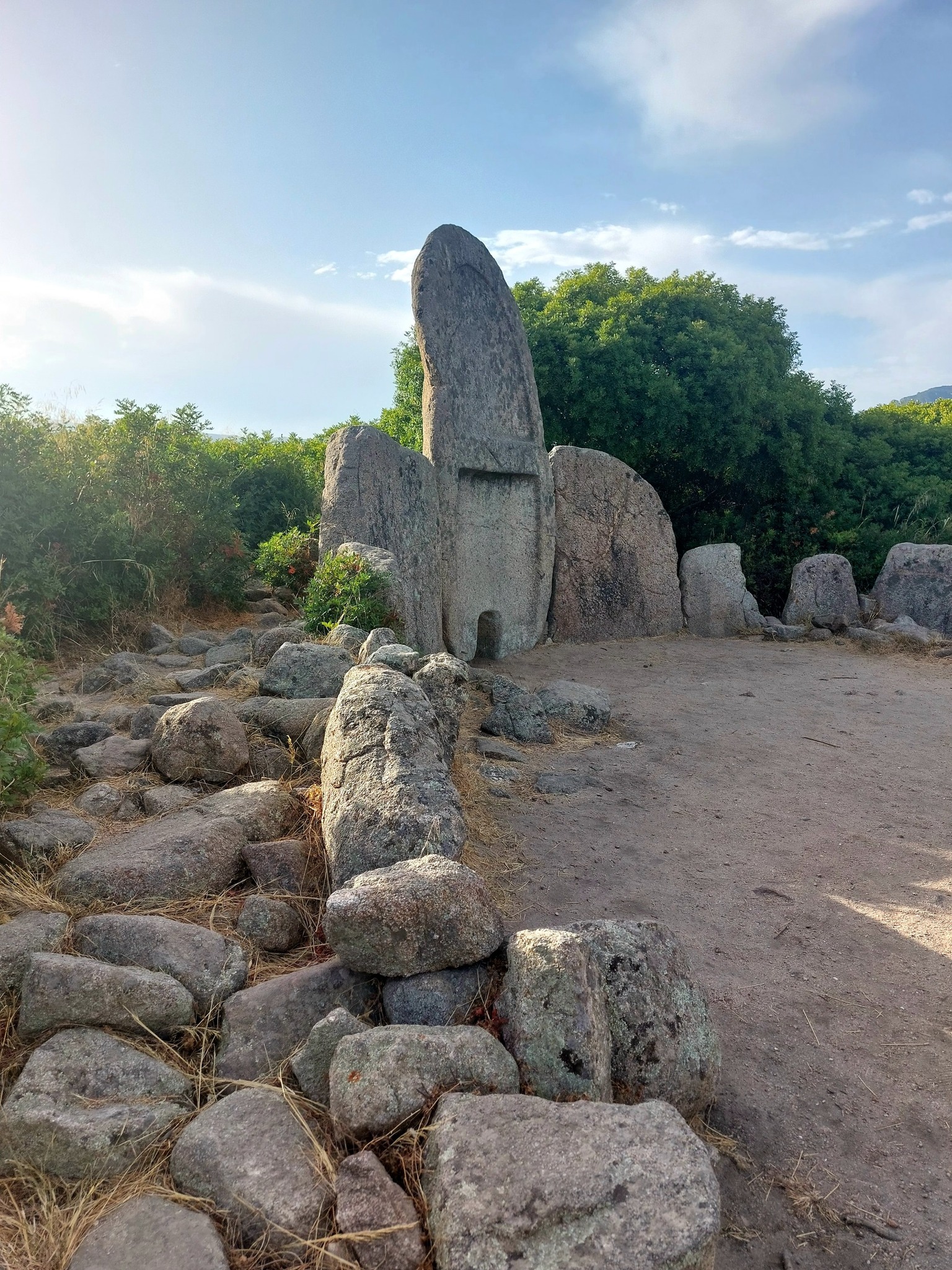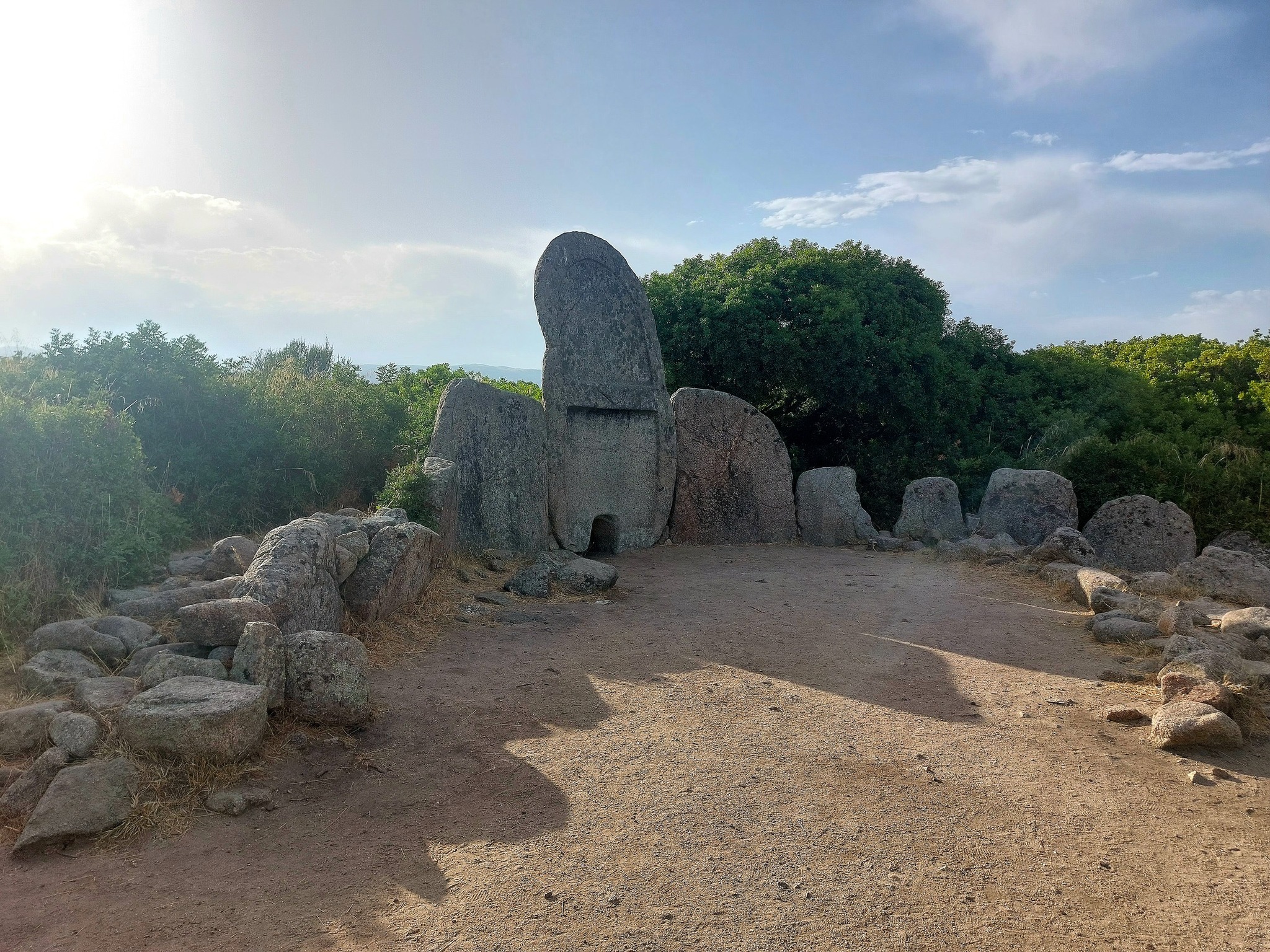 Questa tomba di tipo dolmenico, del periodo del Bronzo Antico, si presenta in ottimo stato di conservazione, infatti conserva quasi intatto il corridoio funebre con copertura a piattabanda, cioè costituita da lastre di pietra disposte orizzontalmente lungo le pareti del corridoio. La grande stele è costituita da un monolite centinato, in cui è scavato il piccolo portello d’accesso alla camera funeraria. L’esedra conserva ancora alcune pietre infisse come erano in origine. (www.ilportalesardo.it)
