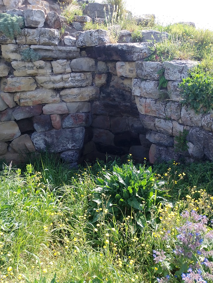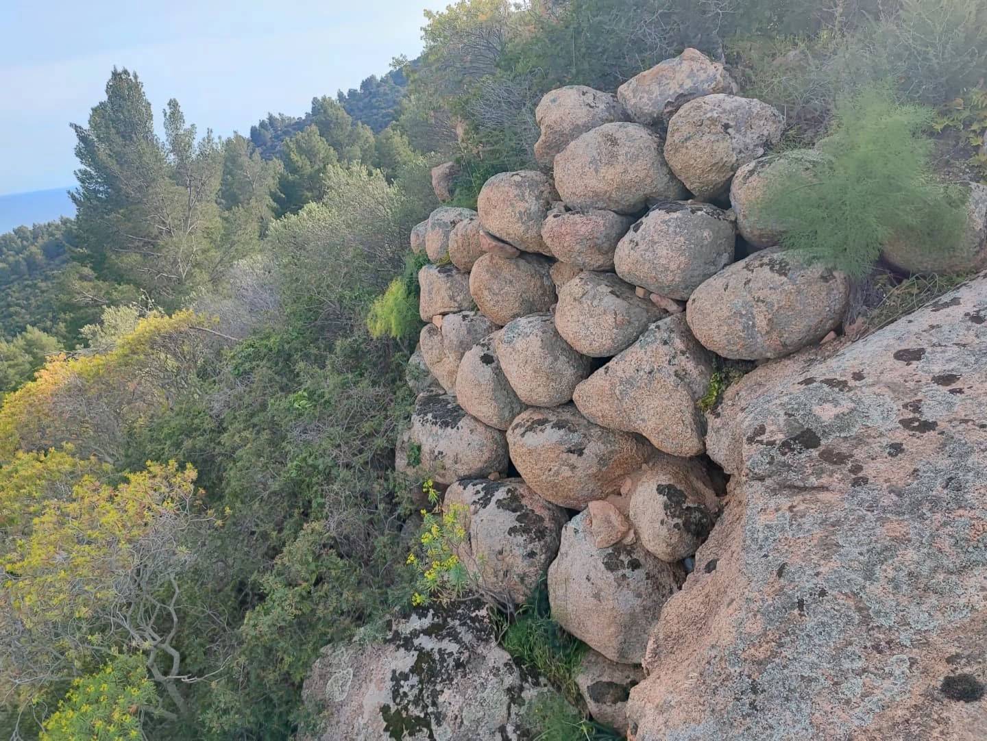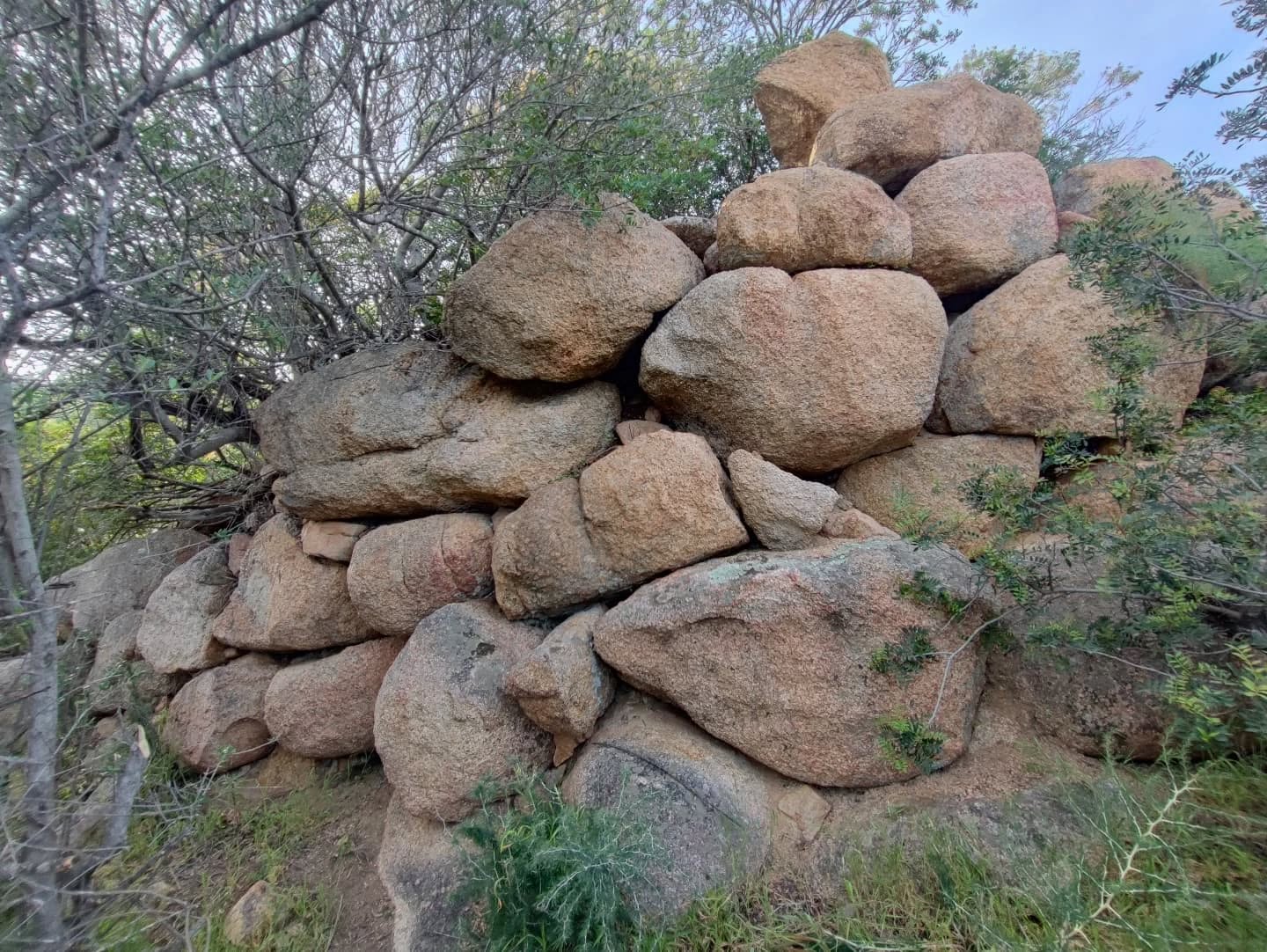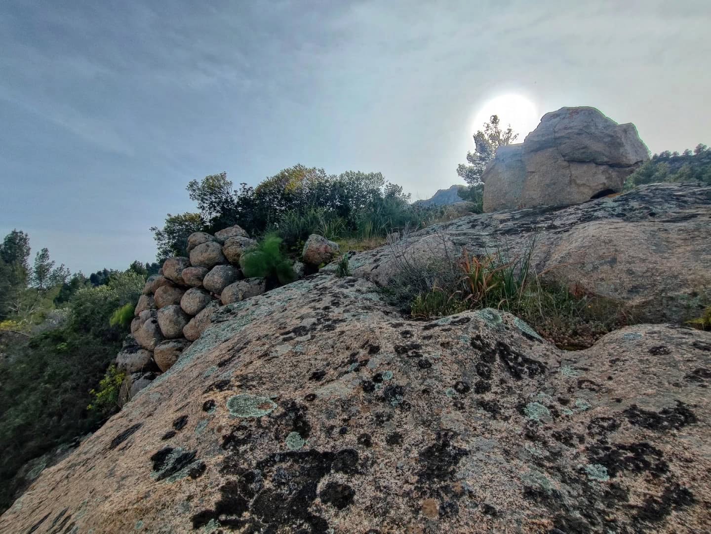 Nasce appoggiato ad un grosso sperone roccioso della medesima pietra  di colore rosato che ne chiude in direzione sud est un quarto della circonferenza. Allo stato attuale non è possibile determinarne l’ubicazione  dell’ingresso. L’edificio nuragico ha subito il crollo della tholos verso l’interno e di molto materiale dal lato est. Dalla sua posizione domina uno spazio visivo in direzione est amplissimo che spazia da nord  a sud per decine e decine di kilometri. La zona circostante purtroppo è stata ampliamente modificata negli anni ’60 con l’impianto di pini marittimi su tutto il monte che ne hanno modificato la conformazione.