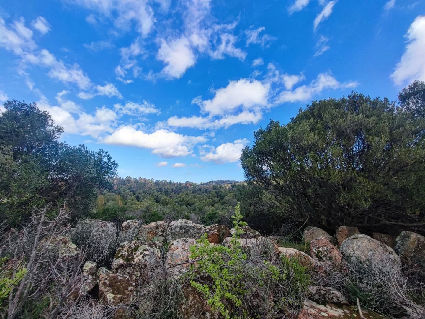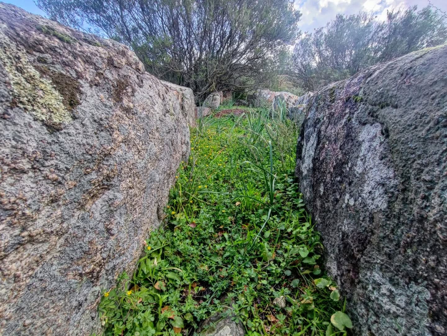 Sulla sommità di una collina appena accennata e nel bel mezzo di un uliveto posto appena sotto la SS387 troviamo questa sepoltura nuragica di cui rimane solo il corridoio e qualche concio dell’esedra.