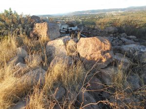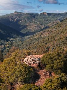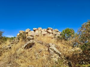 Costituita da lastre di granito infisse a coltello nel terreno, questa sepoltura megalitica risale al Neolitico (Cultura di Arzachena), con un ulteriore riutilizzo durante l’Età del Bronzo.