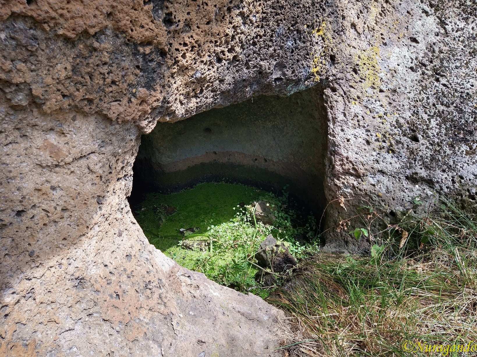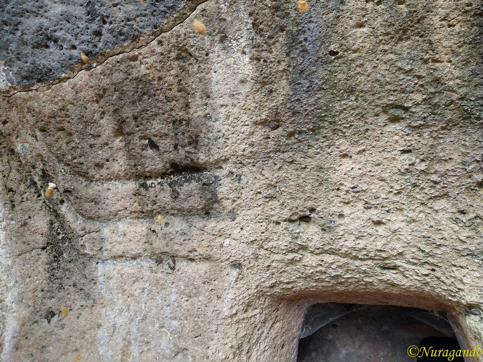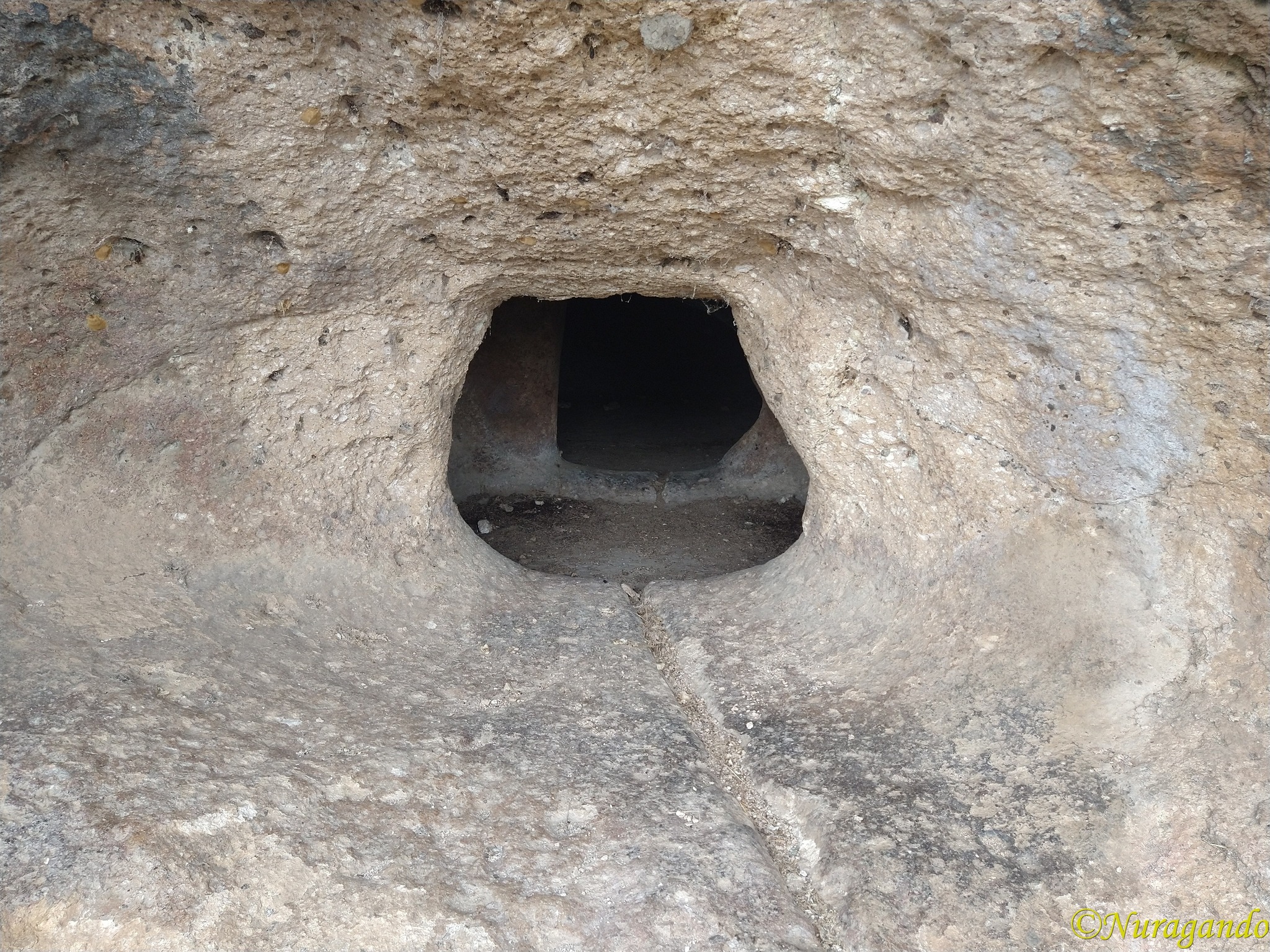 La tomba 2 è aperta anch’essa in un anfratto; comprende l’anticella ed una seconda cella ellissoidale irregolare. Sul portello d’ingresso alla cella è stato osservato un motivo corniforme, ora danneggiato.