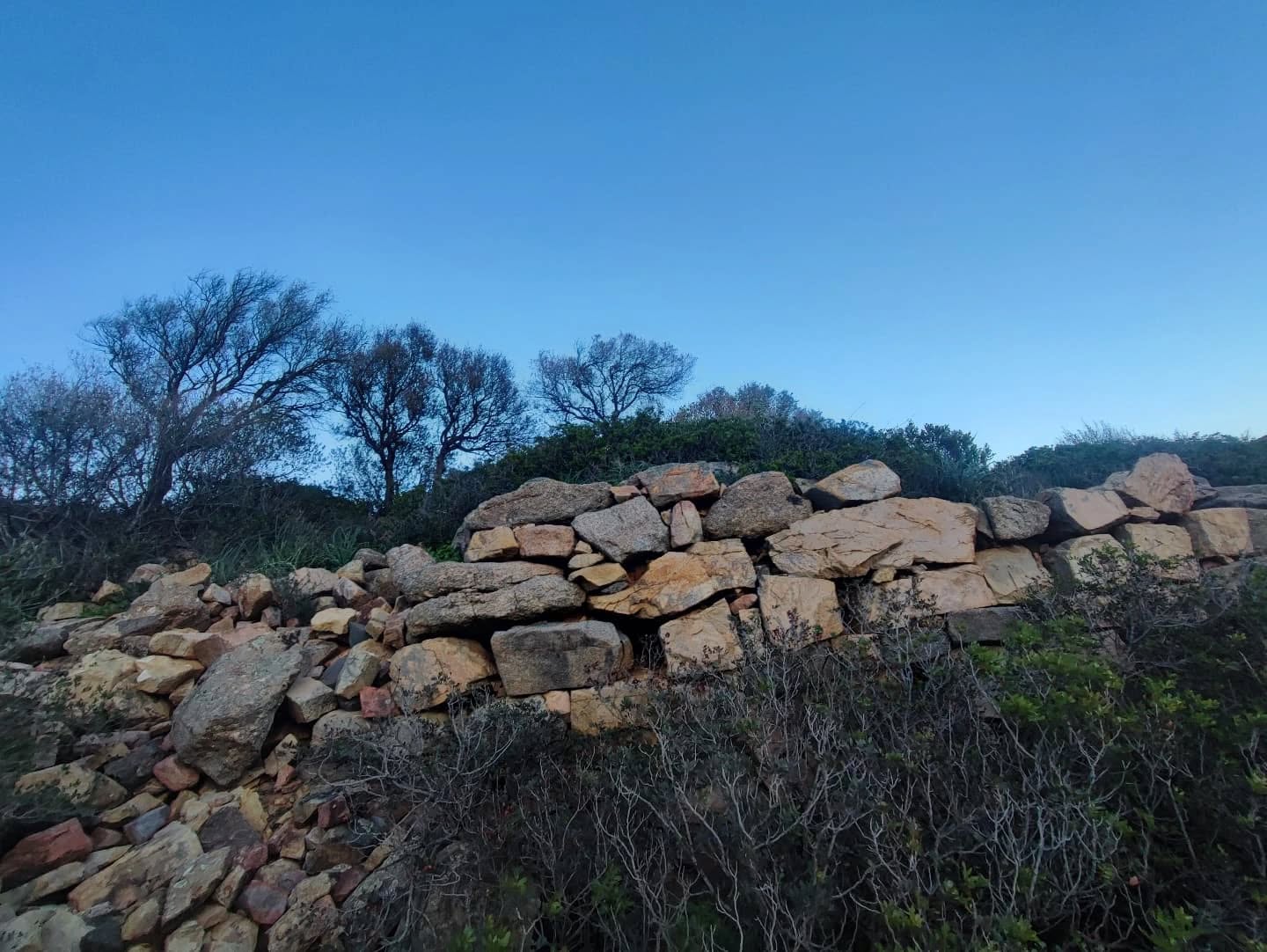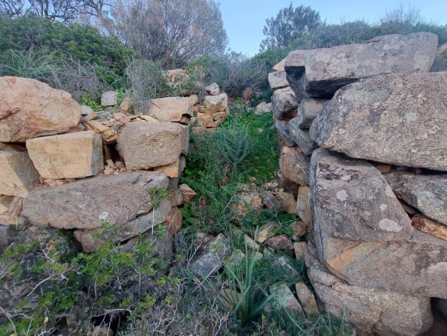 la costruzione è vasta e articolata. L’area delimitata in rosso è quella più alta e ben racchiusa fra muri, tipicamente nuragici, spessi sino a due metri e mezzo. Tutt’attorno si intuisce, però, l’esistenza di altri muri che definivano una superficie ben più ampia, con terrazzamenti a scalare verso l’impluvio a nord. L’edificio dominava la valle, oggi totalmente costruita, che prende il nome dalla chiesetta di Santa Barbara.